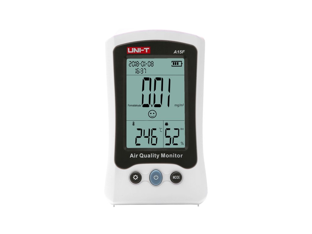 Moderní přístroj UNI-T A15F vám umožní měřit kvalitu vzduchu v reálném čase – sleduje koncentraci formaldehydu (HCHO), teplotu a relativní vlhkost prostředí. Díky velkému, přehlednému LCD displeji s podsvícením získáte okamžitý přehled o kvalitě ovzduší doma, v kanceláři i ve výrobních prostorech.
