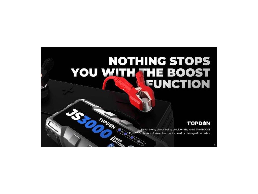 CAR JUMP STARTER JUMPSURGE 3000 Maximálně spolehlivý a výkonný car jump startér JumpSurge 3000 s kapacitou 24000mAh (88,8Wh) a startovacím proudem až 3000A. Ideální zařízení, které kombinuje výkonný a moderní startovací zdroj pro Vaše vozidla, lodě, motocykly, skútry atd. S úžasným výkonem 3000A nastartuje Váš dopravní prostředek při vybité baterii až do maximálního objemu 7.0L pro naftový motor a 9.0L pro benzínový motor a to opakovaně v závislosti na objemu Vašeho motoru. Tento car jump startér můžete používat pro pohotovostní starty nejen vozidel, ale i motocyklů, skútrů, lodí, čtyřkolek, sněžných skútrů, karavanů, osobních i nákladních vozidel s 12V okruhem, atd. Celkem 6 elektronických ochran zajistí bezpečnost Vašeho přístroje, startovacího zdroje JumpSurge 3000, i Vašeho vozidla. Vše na základě předpisů CE a EU. Buďte v bezpečí. Díky kapacitě 24000mAh a podpoře rychlonabíjení QC3.0 jej můžete využít i pro rychlé nabíjení jakékoliv drobné elektroniky. Dále JumpSurge 3000 podporuje nabíjení jakéhokoliv zařízení pomocí konektoru typu Jack s maximálním výkonem 16,8V/10A max. Nabíjet startovací zdroj JumpSurge 3000 můžete pomocí konektoru USB-C (5V/3A,9V/3A, 12V3A, 15V3A, 20V2.25A) Výkonné LED světlo s funkcí SOS se Vám bude hodit při stanování, kempování, rybaření, nebo jako výstražná SOS svítilna. Přednosti: • Výstupní proud až 3000A • Kvalitní Li-ion baterie s kapacitou 24000mAh • Podpora rychlonabíjení standardem QC3.0 • Výkonné LED světlo se třemi módy (stálé, SOS, stroboskop) • Pevné a odolné startovací klipy s ochranou proti přepólování • Start vozidel max 7.0L pro dieselové motory, max 9.0L pro benzínové motory • Podpora rychlého nabíjení přes USB (5V/3A,9V/2A, 12V/1.5A) • Celkem 6 bezpečnostních ochran (Ochrana proti zkratu, přepětí, obrácené polaritě atd.) • Vysoký rozsah pracovních teplot od -10°C do +40°C • Ochrana IP64! • Bohaté příslušenství • Maximální bezpečnost produktu. Technické specifikace: Model: JumpSurge 3000 Baterie Kapacita 88.8Wh/24000mAh Napětí baterie 3.7V Typ Li-ion Životnost bude doplněno Vstupy USB-C (PD) 5V/3A,9V/3A,12V/3A,15V/3A, 45W max. Výstupy Jack 16.8V/10A max. USB-C (PD) 5V/3A,9V/3A,12V/3A,15V/3A, 20V/2.25A 45W max. USB-A (QC) 5V/3A, 9V/2A, 12V/1.5A, 18W max. USB-A 5V/2A Car Jump Start/ Startovací vstup 3000A Doplňující specifikace: Maximální objem motoru pro start max. 7L pro dieslové motory, max. 9L pro benzínové motory Rozměry produktu bude doplněno Rozměry balení bude doplněno Hmotnost bude doplněno Materiál Tvrzené PVC IP ochrana IP64 Příslušenství Ochranné pouzdro, start.kabely,adaptér, nabíjecí kabel USB-C Certifikace CEFS, UKCA, ROHS Pracovní teplota -20°C - +40°C Skladovací teplota -20°C - +75C° Ochrany Ochrana proti zkratu, přepětí, obrácené polaritě, vysoké a nízké teplotě článků, přebíjení, atd. Další LED světlo 400lumenů, SOS módDodatočné parametre