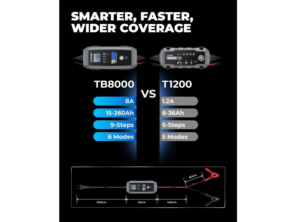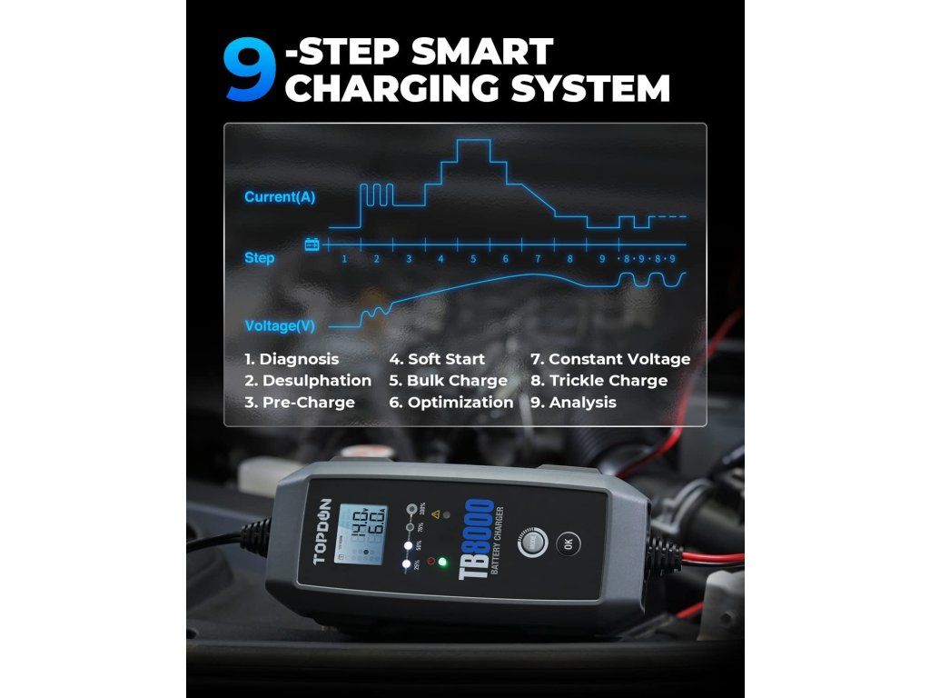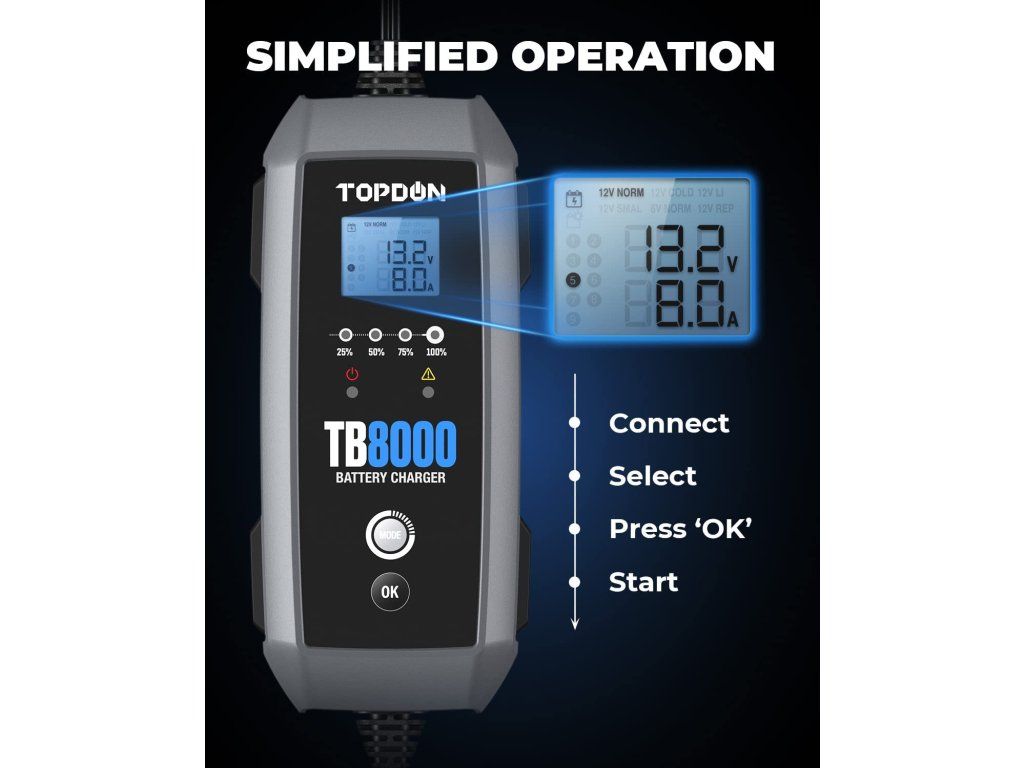 Nabíječka baterií TOPDON TB8000 Nabíječka baterií TOPDON TB8000 nabízí dva nabíjecí proudy 8A a 3A pro baterie od 15Ah do 260Ah. S tímto Jedinečným nástrojem budete moci nabíjet baterie v automobilech, motocyklech, jachtách, nákladních automobilech, SUV, MPV, traktorech a mnoha dalších. Díky 6-ti nabíjecím režimům, 12V/8A Norm, 12V/8A Cold, 12V/8A Lithium, 12V/3A Small Norm, 6V/8A Norm a 12V Repair, si vyberete ten, který bude nejvíce vyhovovat Vašim potřebám! 9STUPŇOVÉ INTELIGENTNÍ NABÍJENÍ PRO VĚTŠÍ BEZPEČNOST 9stupňový systém inteligentního nabíjení TB8000 poskytuje uživatelům špičkovou technologii, která automaticky identifikuje stav baterie a dodává nejvhodnější proud. S tímto zařízením se již nemusíte obávat poškození baterií! TOPDON TB 8000 nabízí vynikající bezpečnostní funkce díky 5-ti vestavěným systémům ochrany proti přepólování, zpětnému nabíjení, zkratu, přehřátí a přepětí. Navíc je tato nabíječka baterií vybavena inovativní technologií pro eliminaci jisker. TOPDON TB8000 je vybaveno ABS proti-hořlavým krytem a je zároveň IP65 vodě a prachu odolný! Technické specifikace: Vhodné pro baterie: 15 - 260Ah Vstupní napětí AC 100-240VAC, 50-60Hz Pracovní napětí AC 100-240VAC, 50-60Hz Účinnost 85% přibližně Výkon 108W Max Nabíjecí napětí různé Nabíjecí proud 12V/8A, 6V/8A, 12V/3A Detekce nízkého napětí 2V(12V), 2V(6V) Obvod zpětného proudu < 5mA Rozměry produktu 278 x 191 x 48 mm, délka kabelu (positive/negative) 1,8m, délka napájecího kabelu 2m Hmotnost 1150g Materiál ABS IP ochrana IP65, přirozené chlazení Příslušenství Krokosvorky, konektor s očkem Pracovní teplota -10°C to 40°C Ochrany Ochrana proti přepólování, jiskření, přebíjení, nadproudy, otevřenými obvody, zkraty a přehřátímDodatočné parametre