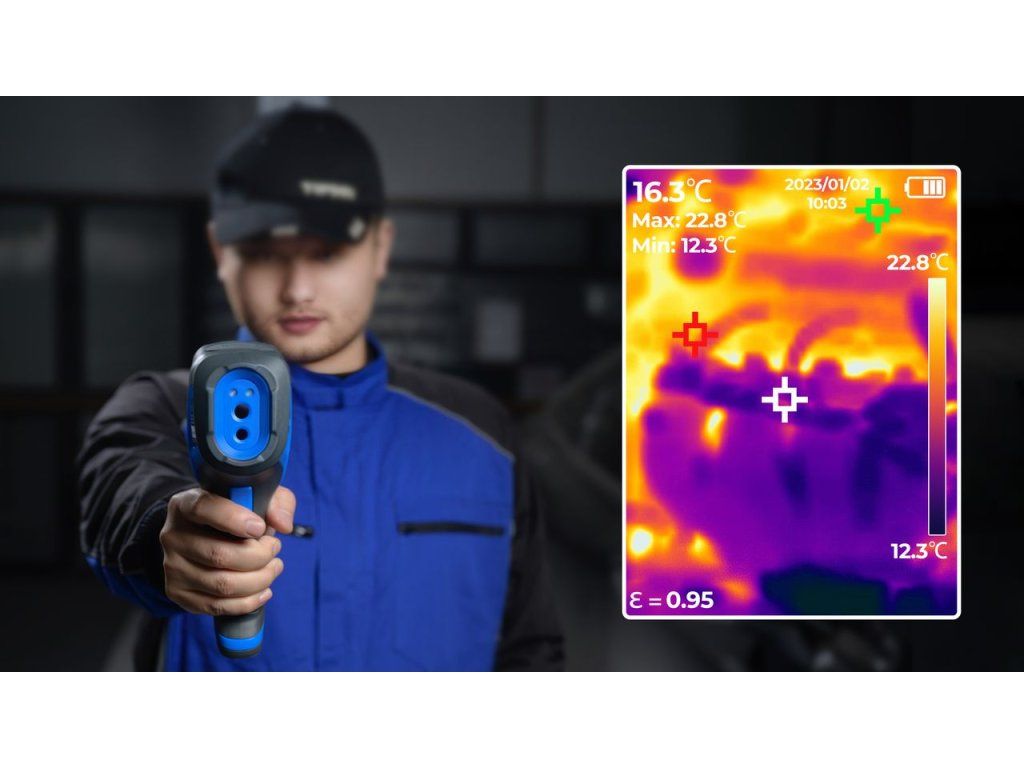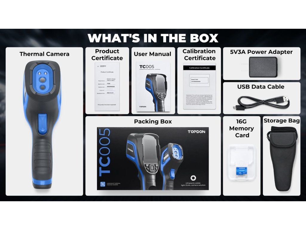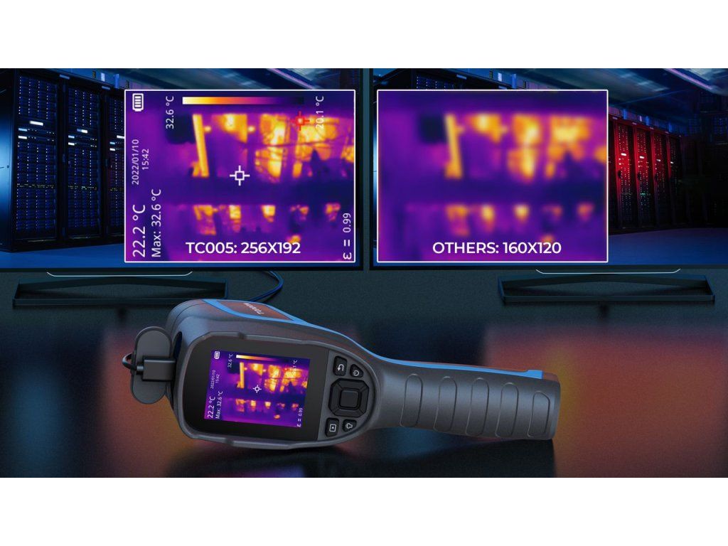 TOPDON TC005 termální infrakamera S infrakamerou TOPDON TC005 s vysokým rozlišením 256 x 192 pixelů se můžete rozloučit s rozmazanými snímky! Kamera je připravena analyzovat scénáře jak v samostatném režimu, tak v režimu zobrazení obrazu na PC v reálném čase, což také umožňuje zaznamenané snímky ihned nahrávat z TC005 do počítače a dále s nimi pracovat. ČTYŘI ZOBRAZOVACÍ REŽIMY TC005 disponuje čtyřmi zobrazovacími režimy pro včasnou identifikaci cíle. Patří mezi ně: režim tepelného zobrazování režim duálního světla režim viditelného světla režim ''obrazu v obraze'' Mezi další výhody TC005 patří 7 barevný display s možností pro Pseudo-Color Display 2megapixelová kamera ve viditelném světle pro překrývající se snímky a režim ''obraz v obraze''. VYSOKÉ ROZLIŠENÍ A TEPLOTNÍ CITLIVOST TC005 je vybaven termokamerou s vysokým rozlišením 256x192 pixelů. To uživatelům umožňuje zachytit více detailů a rozloučit se s rozmazanými snímky. Vysoká tepelná citlivost 0,05? umožňuje TC005 rozlišit i ty nejmenší teplotní rozdíly. TŘI MÓDY MĚŘENÍ A AUTO-DETEKCE TC005 má tři různá měření pro detekci středu, horkých a studených bodů. Funkce automatické detekce umožňuje uživatelům lépe vidět teplotní rozdíly. ŠIROKÉ FOV (Field Of View = Zorné pole) TC005 má široké 56° FOV pro snadné zachycení více objektů. Není zde ani potřeba upravovat ohniskovou vzdálenost. ŠIROKÝ ROZSAH MĚŘENÍ A PŘESNOST TC005 nabízí široký rozsah měření teploty -20°C - +550°C. Měření teploty s přesností ±2°C. NETD (Noise-equivalent temperature = Šumově ekvivalentní teplota je mírou citlivosti detektoru tepelného záření v infračervené, terahertzové nebo mikrovlnné části elektromagnetického spektra.) Tohoto vysoce přesného infračerveného senzoru je menší než 40 mK, přesnost měření je 0,1 stupně a chyba je menší než 2 %. Tyto specifikace Vám zajistí co nejpřesnější měření teploty. PC ANALÝZA A OKAMŽITÁ PROJEKCE OBRAZU Profesionální analytický software umožňuje uživatelům snadno ukládat a sdílet diagnostická data na PC. TC005 také podporuje promítání obrazovky na PC v reálném čase. PŮLDENNÍ VÝDRŽ Vestavěná výkonná baterie umožňuje TC005 pracovat po dobu 12hodin. VESTAVĚNÉ LED SVĚTLO Vestavěné zápustné LED světlo umožňuje uživateli zaznamenávat teplotní údaje bez nutnosti dalšího světelného zdroje. VYROBEN TAK, ABY VYDRŽEL! Stupeň krytí IP54 pro ochranu proti vodě a prachu a odolnost proti pádu z výšky 2 m vám umožní být při používání zařízení bezstarostný. TECHNICKÉ SPECIFIKACE Rozměry 24 x 70 x 90 mm Hmotnost 520g Velikost displeje 2,8'' (7,1cm) Rozlišení 256 x 192 pixelů Teplotní rozsah od -20 do 550°C Spektrální rozsah 8 – 14µm Frekvence snímků 20 Hz Ohnisková vzdálenost 3,2 mm Tepelná citlivost <40mK @ 25°CDodatočné parametre