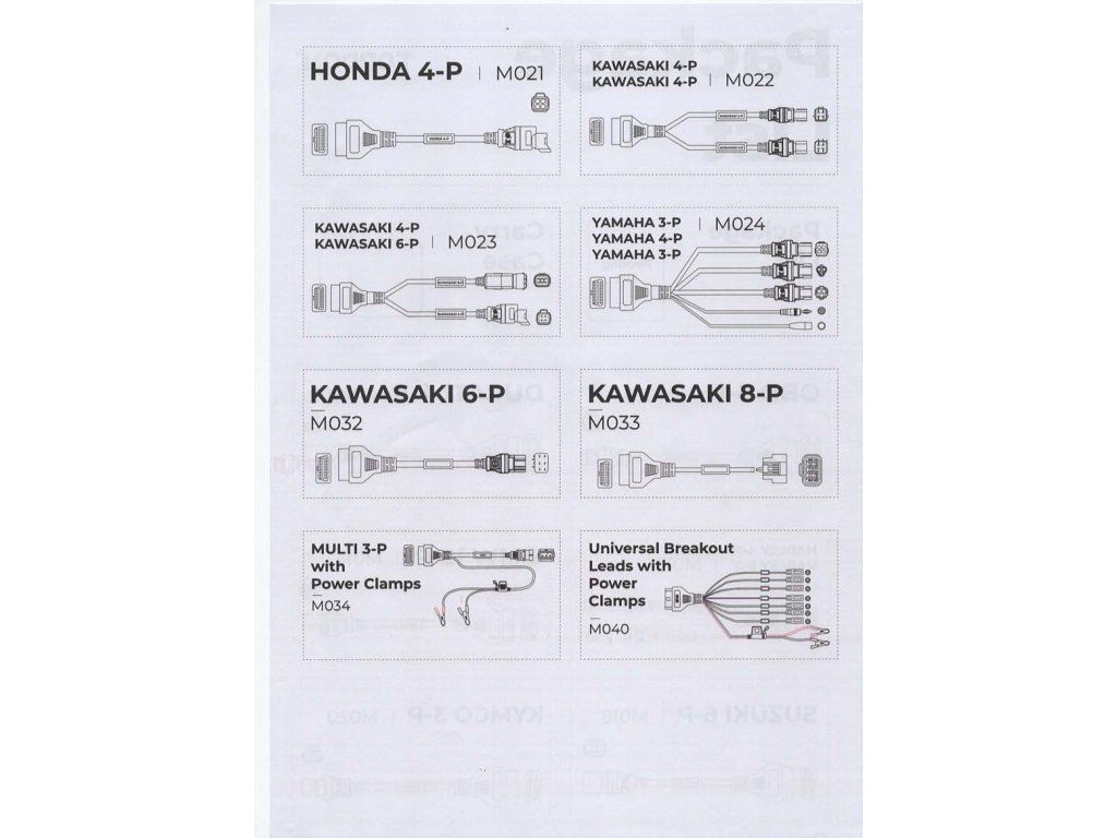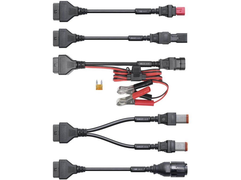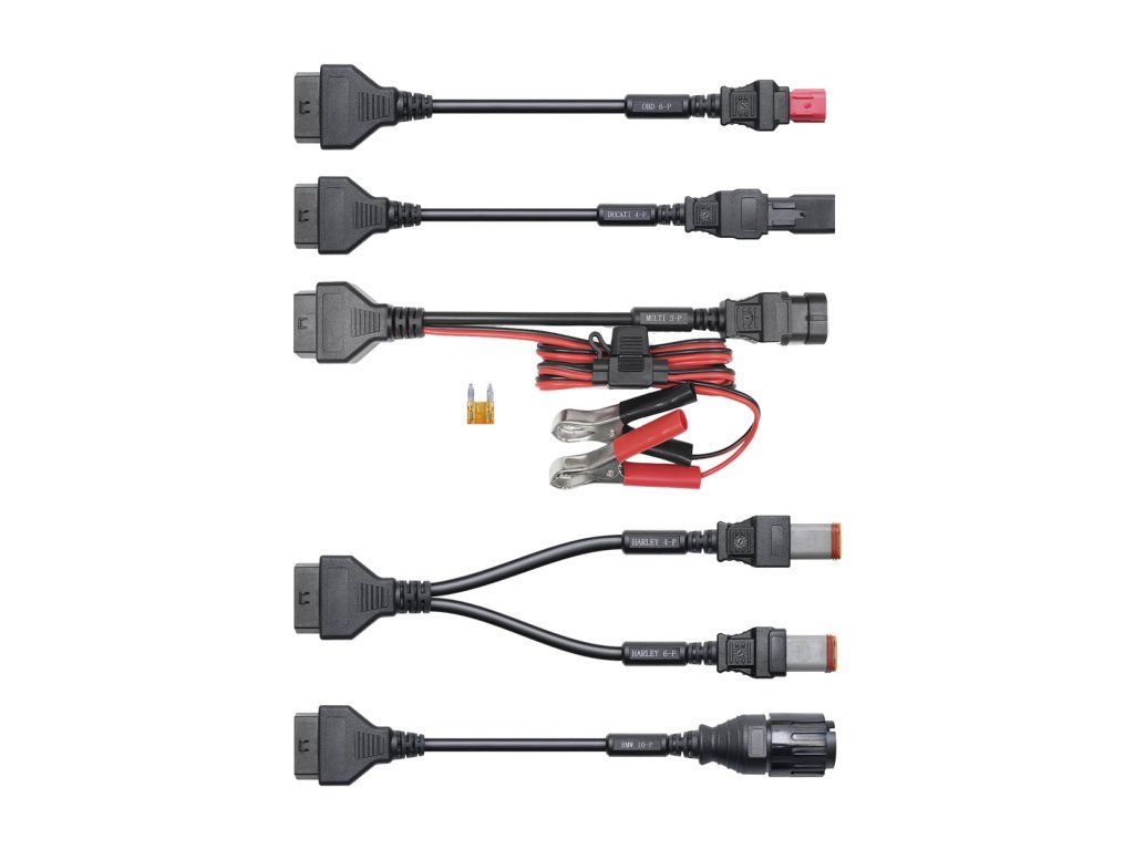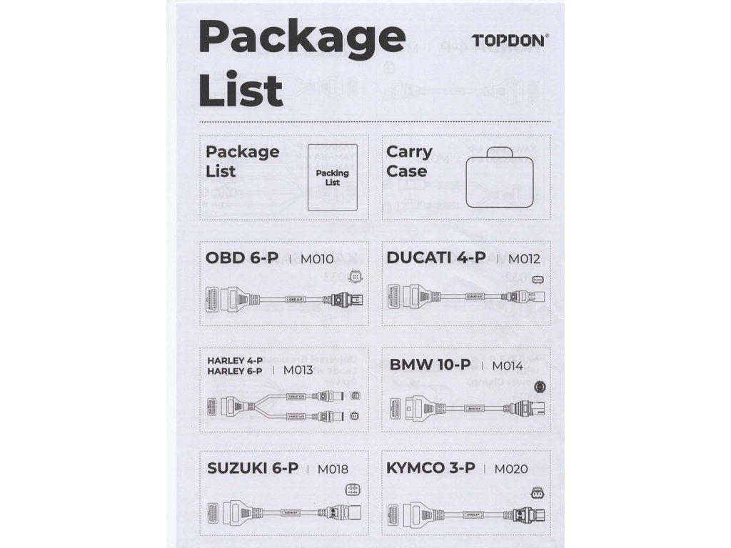Topscan Moto Master Kabelová Sada slouží k propojení motocyklu s diagnostickým zařízením TopScan Moto. Topscan Moto Master Kabelová Sada Topscan Moto Master Kabelová Sada slouží k propojení motocyklu s diagnostickým zařízením TopScan Moto. Tento adaptér umožňuje správné připojení motocyklů konkrétní značky k zařízení, což umožňuje čtení diagnostických dat a provádění servisních kontrol. Použití kabelové sady je nezbytné pro motocykly, které nejsou vybaveny standardním OBD-II portem. Kabelová sada je navržena pro spolehlivý přenos dat mezi motocyklem a diagnostickým zařízením, což vám usnadní provádění diagnostiky, zjištění závad a optimalizaci výkonu. Tato sada obsahuje značky BMW, Harley, Ducati, Kawasaki, Honda, Yamaha, Suzuki. Sada obsahuje: 1ks - M014 (BMW 10-P) 1ks - M013 (HARLEY 4-P, HARLEY 6-P) 1ks - M010 (OBD 6-P) 1ks - M012 (DUCATI 4-P) 1ks - M034 (MUTI 3-P se svorkami) 1ks - M021 (HONDA 4-P) 1ks - M020 (KYMCO 3-P) 1ks - M022 (KAWASAKI 4+4-P) 1ks - M023 (KAWASAKI 4+6-P) 1ks - M032 (KAWASAKI 6-P) 1ks - M033 (KAWASAKI 8-P) 1ks - M024 (YAMAHA 3+4+3-P) 1ks - M018 (SUZUKI 6-P) 1ks - M040 (Univerzální rozbočovací kabely se svorkami) 1ks - Přenosný kufříkDodatočné parametre