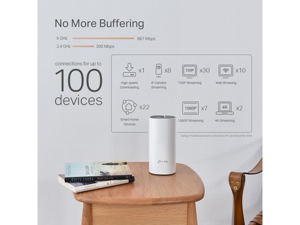 *Třída bezdrátového připojení: AC1200 + HomePlug AV1000 *WiFi + PLC Hybrid Mesh: Hybridní síť účinně zesiluje šířku pásma *U elektrického vedení již neexistují žádné hranice stěn ani vzdálenosti. Užijte si domácí WiFi kdekoli! *Jednoduché a chytré: S aplikací Deco můžete snadno nastavit a spravovat svou síť *Hardware je kompatibilní s Amazon Alexa *Maximální rozsah: Pokrytí WiFi až 4 000 čtverečních stop / 370 m2 (2-balení) *Podporuje připojení až pro 100 zařízení Mesh Wi-Fi + Powerline: Signál skrz zdi Deco P9 kombinuje duální Wi-Fi a powerline pro vytvoření silnější mesh sítě. Technologie Powerline využívá elektrické rozvody vašeho domu k vytvoření silnějšího propojení mezi jednotkami Deco tím, že snižuje dopad stěn a jiných překážek na signál a poskytuje ještě vyšší rychlosti sítě a skutečně bezproblémové pokrytí . Hybridní systém pro celý dům poskytuje rozšířené pokrytí až do plochy 4 000 čtverečních stop / 370 m2 s pomocí kombinace dvou pásem Wi-Fi a elektrického vedení. Eliminujte oblasti se slabým signálem v celé domácnosti pomocí Wi-Fi a již nemusíte hledat stabilní připojení. TP-Link Mesh znamená, že jednotky Deco spolupracují na vytvoření jedné jednotné sítě. Váš telefon nebo tablet se automaticky připojí k nejrychlejšímu Deco během vašeho pohybu doma a vytváří skutečně bezproblémový Wi-Fi zážitek. Jednoduchá, intuitivní rodičovská kontrola usnadňuje udržení dětí v bezpečí, když jsou online. * Všechny Deco produkty pracují společně Odkaz na web výrobce: https://www.tp-link.com/cz/home-networking/deco/deco-p9(3-pack)/ TECHNICKÁ SPECIFIKACE Napájení *AC síťový adaptér: 100-240V ~ 50/60Hz 0.5A Hardwarové funkce *Processor: Qualcomm CPU *Rozhraní: 2 Gigabit ethernetové porty (automatické snímání WAN / LAN) na každou jednotku Deco *Tlačítka: 1 Resetovací tlačítko na spodní straně *Externí napájení: napájecí kabel *Rozměry: 7,5 palce x 3,6 palce x 3,6 palce (190 mm x 90,7 mm x 90,7 mm) *Typ antény: 2 interní dvoupásmové antény na každou jednotku Deco Bezdrátové funkce *Bezdrátové standardy: IEEE 802.11 ac / n / a 5 GHz, IEEE 802.11 b / g / n 2,4 GHz *Frekvence: 2,4 GHz a 5 GHz *Rychlost signálu: 300 Mbps na 2,4 GHz a 867 Mbps na 5 GHz *Vysílací výkon FCC: FCC: <30 dBm, CE: <20 dBm (2.4 GHz), <23 dBm (5 GHz) *Zabezpečení bezdrátové sítě: WPA-PSK/WPA2-PSK *Pokročilé funkce: *Režim směrovače / přístupového bodu *Volitelný Ethernet Backhaul *Hostující síť *Technologie Mesh TP-Link: MU-MIMO, Automatický výběr cesty, Self-Healing, Řízení AP, Pásové řízení, Tvarování paprsků Softwarové funkce *Kvalita služby WMM *Podpora IPv6 *Typ WAN: Dynamická IP / Statická IP / PPPoE / L2TP / PPTP *Správa: Lokální správa, Vzdálená správa *DHCP: Server, Client *Podpora port forwarding *Řízení přístupu: Blacklist *Zabezpečení brány Firewall : SPI Firewall *Protokoly: IPv4 a IPv6 *Pokročilé funkce: Rodičovská kontrola, Kvalita služeb, měsíční reporty *Hostující síť: 2,4 GHz 1x / 5 GHz 1x *Podpora tvarování paprsků *APP: snadné nastavení pomocí Deco app Elektrické vedení *Rychlost signálu: 1 000 Mb/s *Standard: HomePlug AV2 Ostatní *Certifikace: CE, FCC, RoHS *Požadavky na chytrý telefon / tablet: iIS 9.0 nebo novější / Android 4.3 nebo novější Přírodní prostředí *Provozní teplota prostředí: 0 ? ~ 40 ? (32 ? ~ 104 ?) *Skladovací teplota: -40 ? ~ 70 ? (-40 ? ~ 158 ?) *Provozní vlhkost: 10% ~ 90% nekondenzující *Vlhkost při skladování: 5% ~ 90% nekondenzující Obsah balení *3 Deco jednotky *1 ethernetový kabel RJ45 *3 napájecí kabely *1 průvodce rychlou instalacíDodatočné parametre