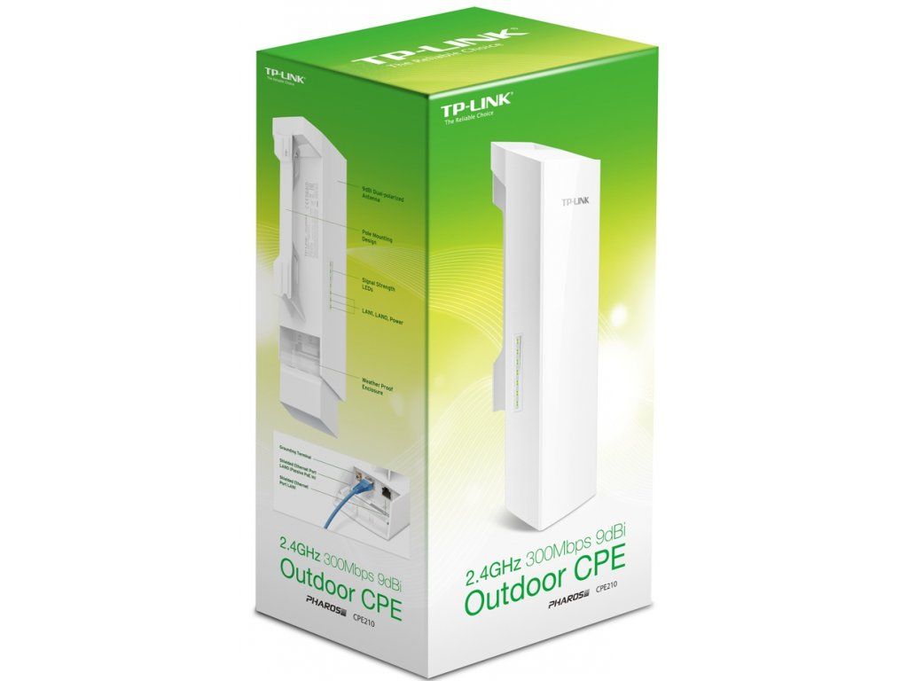 TP-Link CPE210 Outdoor 2,4GHz 300Mbps OVERVIEW * Built-in 9dBi 2x2 dual-polarized directional MIMO antenna * Adjustable transmission power from 0 to 27dBm/500mw * System-level optimizations for more than 5km long range wireless transmission * TP-LINK Pharos MAXtream TDMA (Time-Division-Multiple-Access) technology improves product performance in throughput, capacity and latency performance, ideal for PTMP applications * Centralized Management System - Pharos Control * AP / Client / Repeater / AP Router / AP Client Router (WISP) operation modes * Passive PoE Adapter supports up to 60 meter (200 feet) Power over Ethernet deployment and allows the device to be reset remotely SPECIFICATIONS HARDWARE FEATURES Processor * Qualcomm Atheros 560MHz CPU, MIPS 74Kc Memory * 64MB DDR2 RAM, 8MB Flash Interface 1 10/100Mbps Shielded Ethernet Port (LAN0,Passive PoE in) 1 Grounding Terminal 1 Reset Button Dimensions (W X D X H) * 224 x 79 x 60 mm Antenna Type * Built-in 9dBi 2x2 Dual-polarized Directional Antenna * Beam Width: 65°, (H-Plane) / 35°, (E-Plane) * Note: For more details, please refer to datasheet Protection * 15KV ESD Protection * 6000V Lightning Protection Power Consumption * 10.5 Watts Max * Note: When deployed using Passive PoE, the power drawn from the power source will be higher by some amount depending on the length of the connecting cable. Power Supply * Passive Power over Ethernet via LAN0 (+4,5pins, -7,8pins) * Voltage range: 16-27VDC Enclosure * Outdoor ASA stabilized plastic material * IPX5 waterproof Certification WIRELESS FEATURES Wireless Standards * IEEE 802.11b/g/n (with Pharos MAXtream disabled) Proprietary Protocol * TDMA Mode (with Pharos MAXtream enabled) Wireless Speeds * Up to 300Mbps (40MHz,Dynamic) * Up to 144.4Mbps (20MHz,Dynamic) * Up to 72.2Mbps (10MHz,Dynamic) * Up to 36.1Mbps (5MHz,Dynamic) Frequency * 2.4~2.483GHz * Note: Available operating frequency may vary depending on the limitations of the countries or regions in which the device is used. Reception Sensitivity * 802.11b: - 11M: -95dBm, 5.5M: -96dBm, 2M: -96dBm, 1M: -96dBm * 802.11g: - 54M: -79dBm, 48M: -80dBm, 36M: -84dBm, 6-24M: -88dBm * 802.11n: - MCS15: -76dBm, MCS14: -78dBm, MCS13: -80dBm, - MCS12: -84dBm, MCS11: -87dBm, MCS10: -91dBm, - MCS9: -93dBm, MCS8: -96dBm, MCS7: -76dBm, - MCS6: -78dBm, MCS5: -80dBm, MCS4: -84dBm, - MCS3: -87dBm, MCS2: -91dBm, MCS1: -93dBm, MCS0: -96dBm Transmission Power * 27dBm/500mw (Adjustable power by 1dBm) * Note: Maximum transmission power may vary across different channels depending on the limitations of the countries or regions in which the device is used. SOFTWARE FEATURES Wireless Configurations * Pharos MAXtream TDMA Technology * 802.11b/g/n Modes * Selectable Channel Width: 5/10/20/40MHz * Automatic Channel Selection * Transmission Power Control * Dynamic Frequency Selection (DFS) * WDS Enable/Disable * Security: WPA/WPA2, WPA-PSK/WPA2-PSK (AES/TKIP) Encryption, 64/128/152-bit WEP Encryption * SSID Broadcast Enable/Disable * Multi-SSID with VLAN Tagging (AP mode only) * Distance/ACK Timeout Setting * Wireless MAC Address Filter * Wireless Advanced: * > Beacon Interval/RTS Threshold/Fragmentation * >Threshold/DTIM Interval/AP Isolation/Short GI/Wi-Fi Multimedia Management * Discovery and Remote Management via Pharos Control application * HTTP/HTTPS Web-based management * System Log * SNMP Agent(v2c) * Ping Watch Dog * Dynamic DDNS * SSH Server System Tools * Wireless Signal Quality Indicators: * Signal Strength/Noise/Transmit CCQ/CPU/Memory * Monitors: Throughput/Stations/Interfaces/ARP/Routes/WAN/DHCP * Spectrum Analyzer * Speed Test * Ping * Traceroute System-level Optimizations * Optimized IGMP Snooping/Proxy for multicast applications * Hardware watch dog OTHERS Certification * CE, FCC, RoHS, IPX5 Package Contents * Outdoor Wireless CPE * 24V 0,25A Passive PoE Adapter * Pole Mounting Straps * AC Power Cord * Installation Guide System Requirements * Microsoft Windows 98SE, NT, 2000, XP, Vista™ or Windows 8, Windows 7, MAC OS, NetWare, UNIX or Linux. * Note: We recommend you to use one of following Web browsers for an improved user experience: Google Chrome, Safari, and Firefox. IE browsers are not recommended. Environment * Operating Temperature: -30°,C~70°,C * Storage Temperature: -40°,C~70°,C * Operating Humidity: 10%~90% non-condensing * Storage Humidity: 5%~95% non-condensing POE ADAPTER FEATURES Button * Remote Reset Button Certifications * CE/FCC/UL/IC/GS/PSB/C-tick/SAA/S-Mark/KC-mark Dimensions(W x D x H) * 110*57*33.5mm Efficiency * >80% Input * 100-240VAC, 50/60Hz Input Current * 0.8A Max @ 100VAC Input Voltage * 100VA~240VAC @ 50Hz~60Hz Interfaces * 1 AC Jack with Earth Ground * 1 10/100Mbps Shielded Ethernet Port (Power + Data) * 1 10/100Mbps Shielded Ethernet Port (Data) Output * 24VDC, 1.0A Max * +4, 5pins, -7, 8pins. (Support up to 60m Power over Ethernet) Output Voltage * 24VDC(+4,5pins, -7,8pins) Power Status LEDs * 0~0.8A: Green * 0.8A~1.0A: RedDodatočné parametre