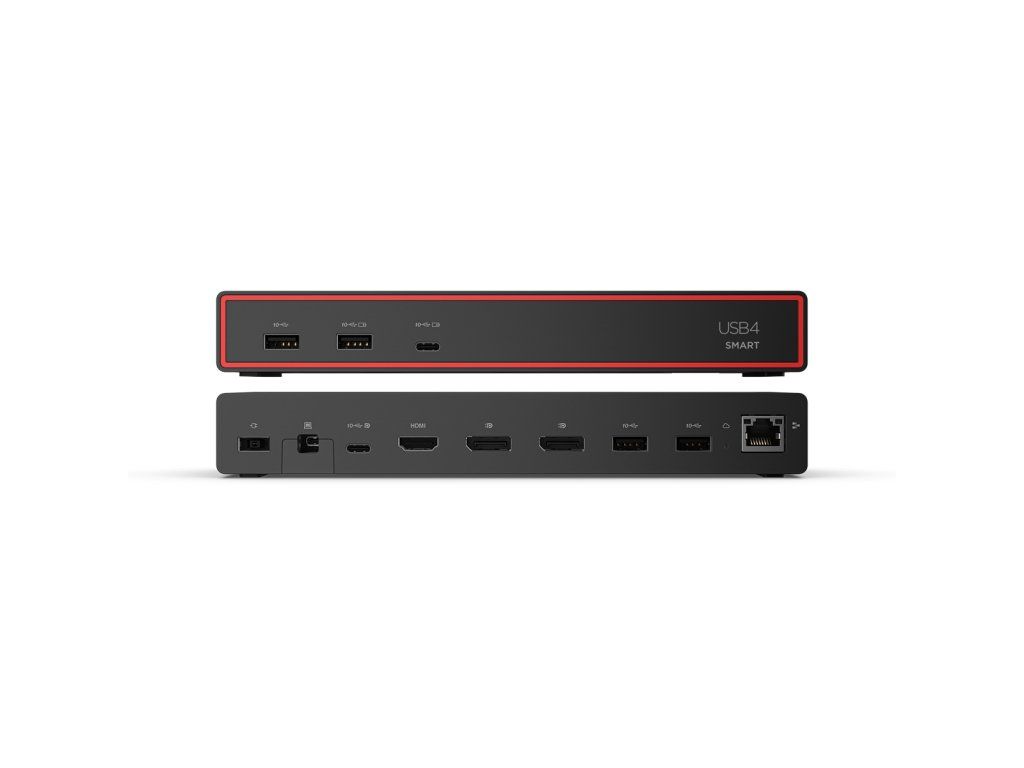 LENOVO dokovací stanice ThinkPad USB4 Smart Dock 5500 - 135W adaptér (100W PD) Lenovo ThinkPad USB4 Smart Dock 5500, navržený pro zvýšení každodenní produktivity, je špičkou v nové řadě USB doků a nabízí chytřejší způsob práce. Díky zcela novému softwaru Lenovo Accessories Fleet Manager (LAFM) od AWS for IT Manager má dokovací stanice šířku pásma 40 Gb/s s připojením k notebooku přes USB4, což vám umožní rozšířit sestavu monitoru o více pixelů a vyšší obnovovací frekvence. Vlastnosti: * tato dokovací stanice s nejnovější technologií USB4 zvyšuje výkon připojení ve srovnání s USB-C 3.2 Gen 2 až čtyřnásobně. S šířkou pásma až 40 Gb/s můžete mít až jeden displej s ultravysokým rozlišením 8K a 60 Hz nebo dva monitory s rozlišením 4K a 144 Hz a vysokou obnovovací frekvencí, abyste plně rozšířili svůj notebook Lenovo na výpočetní platformu se všemi druhy periferních zařízení. Podporuje PD 3.1 a má výkon až 100 W pro rychlé nabití notebooku, takže můžete snadno rozšířit potenciál svého pracovního prostoru. * univerzální dokovací stanice, kompatibilita s různými operačními systémy * díky Lenovo Accessories Fleet Manager (LAFM) běží cloudová inteligentní správa nové generace ve webovém prohlížeči a umožňuje IT manažerům spravovat, aktualizovat, konfigurovat a diagnostikovat své dokovací stanice flexibilním, efektivním a pohodlným způsobem kdykoli a kdekoli s lehkostí * podporováno Lenovo Dock Managerem, pokročilým řešením, které automaticky spravuje dokování a zároveň poskytuje aktualizace firmwaru, dotazy k zařízením a analýzy na všech chytrých docích Lenovo Video porty: 2x Display Port 1.4, 1x HDMI 2.1, 1x USB-C plně funkční video port (USB4) USB porty: *přední: 2x USB-A 3.2 Gen 2 (1 AOU, 12 W), 1x USB-C 3.2 Gen 2 (AOU 7,5 W) *zadní: 2x USB-A 3.2 Gen 2, 4,5 W, 1x USB-C 3.2 Gen 2 FullFunction, 7,5 W Zvukové porty: ne Ethernet: 1x gigabitový ethernet *podpora WOL, PXE Boot, MAC adresy pass-through na NB ThinkPad Funkce fyzického zabezpečení: 1x slot pro zámek NanoSaver, 1x slot pro zámek MicroSaver Maximální počet externích monitorů: 4 Maximální rozlišení/obnovovací frekvence: 4x 3840 x 2160 při 60 Hz Nabíjecí port: DC-IN Vstupní výkon: 135 W Power Delivery: ano, PD 3.1 Výstupní výkon: 100 W Tlačítko napájení: ano Typ napájecího konektoru: slim-tip Podporované OS: Win 11, macOS Sonoma, macOS Sequoia Potřeba ovladačů a SW: ano Kompatibilita: https://psref.lenovo.com/accessory/40BC0135EU?tab=Compatibility Barva: Eclipse Black *vyrobeno z 90% post-consumer recyklovaných materiálů Rozměry: 218 x 80 x 31,5 mm Hmotnost: 472 g Obsah balení: *1x ThinkPad USB4 Smart Dock s integrovaným 1m USB4 kabelem *1x 135W napájecí adaptér s tenkým hrotem *1x napájecí kabel * poster pro nastavení * leták Lenovo Accessories Fleet Manager (LAFM) * uživatelská příručka Záruka: 36 měs. Odkaz na stránku výrobce: https://psref.lenovo.com/accessory/40BC0135EUDodatočné parametre