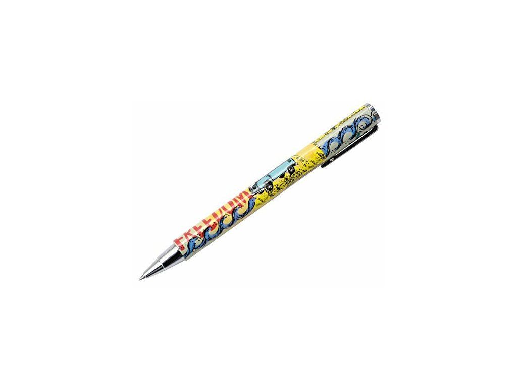 Dodáva sa aj s guľôčkovým perom tiež s motívom VW Bulli vyrobeného z lesklého viacfarebného kovu