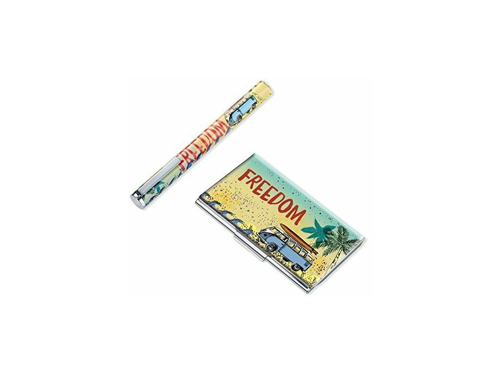 Plochý držiak na vizitky a karty Troika FREEDOM ideálny na cesty a služobné cesty s motívom VW Bulli, vhodný pre 11 vizitiek, vyrobený z lesklého viacfarebného kovu.