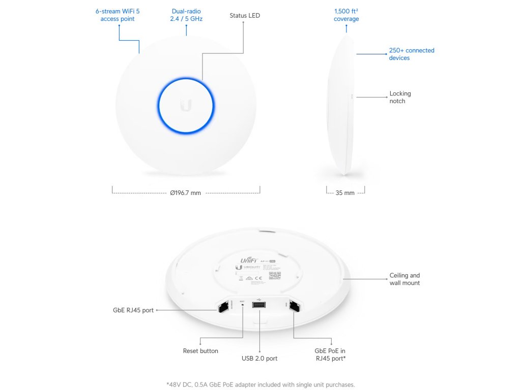 PŘEHLED Ubiquiti UniFi AC Pro je 802.11ac UAP zařízení. Jedná se o 3x3 MIMO 2,4GHz i 5GHz Acess Point s rychlostí přenosu až 1300+450Mbps a podporou norem 802.11a/b/g/n/ac. UAP je určeno například pro kanceláře, hotely, sklady a díky voděodolnému provedení i venkovní prostory (např. pod střechu, není určeno do otevřeného prostoru). Anténní systém obsahuje tři dualband 3dBi antény s dosahem do vzdálenosti až 122 metrů. Plně podporuje také roaming při předávání asociovaných klientů mezi jednotlivými AP. Obsahuje 2x Gigabit LAN s 48V (44až 57V) napájením přes PoE (pasivní i aktivní 802.3af/802.3at). Obsah balení *zařízení *PoE napájecí zdroj *napájecí kabel *kit k přichycení na strop *sada šroubků TECHNICKÁ SPECIFIKACE Frekvence [GHz]: 2,4 + 5 Gigabit LAN: Ano LAN: (2) 10/100/1000Mbps Max. spotřeba energie [W]: 9 Napájení přes PoE: 802.3at Napájení přes PoE: 44 .. 57V DC Operační mód: Access Point Počet LAN portů: 2 Bluetooth: Ano Počet vestavěných antén: 3 Podpora IPv6: Transparentní (režim bridge) PoE: VstupníProvozní teplota [°C]: -10 až 70 Přenosová rychlost WiFi - 2,4GHz [Mb/s]: 450 Přenosová rychlost WiFi - 5GHz [Mb/s]: 1300 Výstupní výkon 2,4GHz [dBm]: 22 Výstupní výkon 5GHz [dBm]: 22 Roaming: Ano Šifrování: WEP, WPA-PSK, WPA-Enterprise (WPA/WPA2,TKIP/AES) Tlačítka: Reset Typ antény: Vestavěná Výchozí IP adresa: Dynamická z DHCP Výchozí jméno a heslo: Ubiquiti/Ubiquiti WiFi standardy: 802.11ac, 802.11n, 802.11a, 802.11b, 802.11g Zisk antény [dBi]: 3 Šířka [mm]: 197 Výška [mm]: 35 Hloubka [mm]: 197 Hmotnost [g]: 350Dodatočné parametre