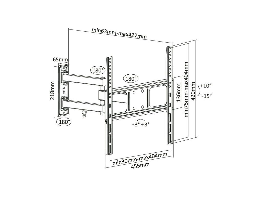 Kvalitný nástenný držiak na montáž televízorov s uhlopriečkou 30" až 55" a hmotnosťou do 35 kg. Nástenný kĺbový držiak na zavesenie všetkých typov televízorov s podporou štandardov VESA 100x100 až 400x400 mm. Kĺbový držiak umožňuje posúvanie televízorov od steny v dĺžke 63 až 427 mm, otáčanie do strán +/- 90°, naklápanie +10° až -15° a korekciu v rovine +/- 3°.