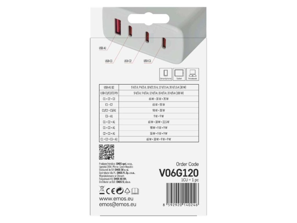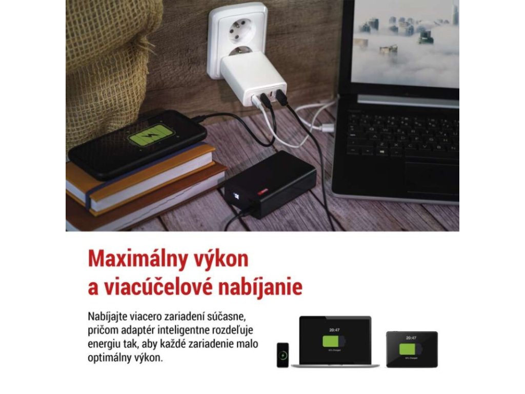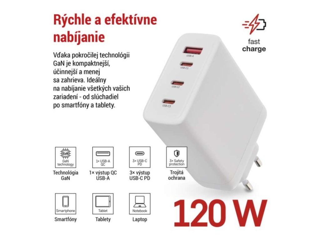 farba: biela|funkcia LED svietidla: neuvádza sa|hmotnosť: 222 g|kábel: nie|kapacita akumulátora: neuvádza sa|kľudový odber prúdu: neuvádza sa|LED indikácia: nie|LED indikátor nabíjania: neuvádza sa|LED indikátor stavu batérie: neuvádza sa|max. výstup 1× USB: A: 5 V/3 A – 9 V/3 A – 10 V/2,25 A – 12 V/2,5 A – 20 V/1,5 A (30 W); C1/C2/C3: 5 V/3 A – 9 V/3 A – 12 V/3 A – 15 V/3 A – 20 V/5 A – 21 V/5 A (105 W)|max. výstup celkom: 120 W|max. zaťaženie – stále: neuvádza sa|max. zaťaženie – v špičke: neuvádza sa|nabíjací: fast|ochrana proti preťaženiu, prepätiu a skratu: áno|počet USB výstupov: 4|predajný obal: 1 ks, papierová krabička|produkt: USB adaptér|rozmer: 57 × 107 × 24 mm|rozmer konektora: neuvádza sa|typ batérie: neuvádza sa|typ napájania: neuvádza sa|určené pre: smartphone, tablet, notebook|vstupné napätie: 100–240 V~ 50/60 Hz|výstupné napätie: neuvádza sa|výstupný prúd: neuvádza saDodatočné parametre