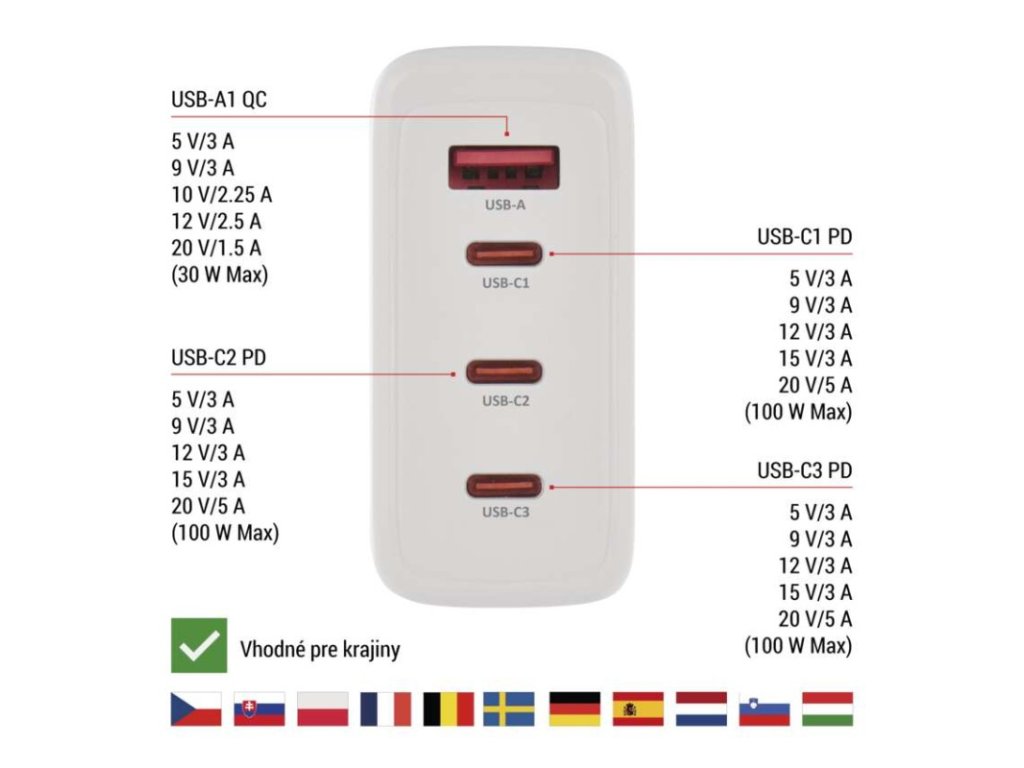 | max. výstup 1× USB: | A: 5 V/3 A – 9 V/3 A – 10 V/2,25 A – 12 V/2,5 A – 20 V/1,5 A (30 W); C1/C2/C3: 5 V/3 A – 9 V/3 A – 12 V/3 A – 15 V/3 A – 20 V/5 A – 21 V/5 A (105 W) |