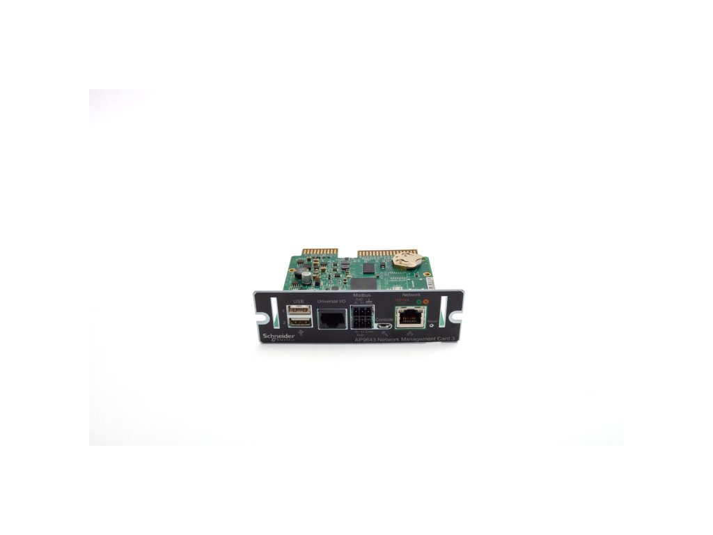 AP9643 UPS Network Management Card 3 with Environmental Monitoring and Modbus SPECIFIKACE Varianta: Environmental monitoring with Modbus Typ komunikace: Ethernet (Network Management Card 3) Podporované fáze vstupu: 1 / 3 Funkce: Bezpečné vzdálené monitorování a řízení UPS, podpora Modbus, připojení environmentálních senzorů, správa přes síťové rozhraní FYZICKÉ Výška [cm]: 3,8 Šířka [cm]: 12,1 Hloubka [cm]: 10,8 Čistá hmotnost [kg]: 0,14 Záruka: 24 měsíců Odkaz na web výrobce: https://www.se.com/us/en/product/AP9643/device-monitoring-and-management-network-management-cards-nmc3-with-environmental-monitoring-and-modbus-secure-remote-ups-monitoring-and-management/Dodatočné parametre