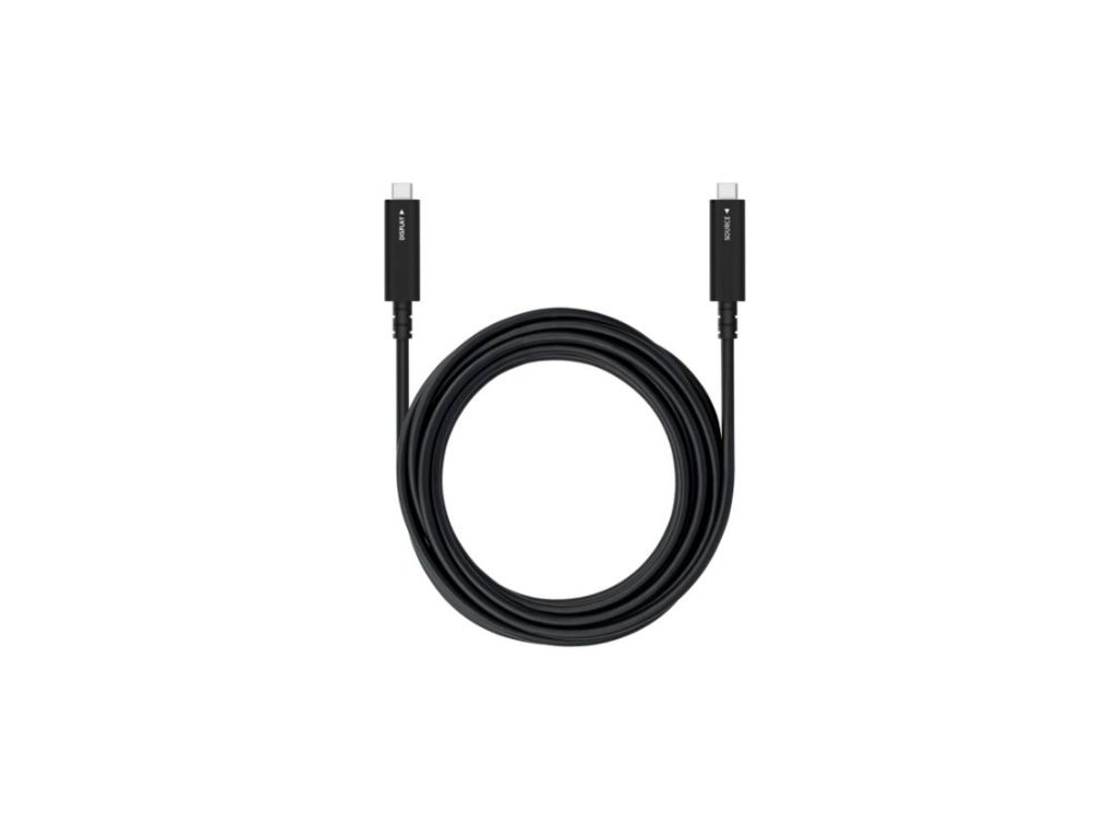 TB Aktivní optický USB-C kabel – 7 m 3A Prémiový aktivní optický kabel USB Type-C je ideálním řešením pro moderní konferenční prostory a scénáře BYOM (Bring Your Own Meeting). V jediném konektoru spojuje přenos obrazu v rozlišení 4K60Hz, data aplikací, dotykové signály a napájení až 60 W. Technické parametry: Délka kabelu: 7 m Průměr kabelu: 6,5 mm Minimální poloměr ohybu: 50 mm DisplayPort Alternate Mode: DP1.4 (4 lanes), USB2.0 Záruka: 1 rok Nepodporuje zařízení vyžadující pouze USB3.x rychlosti Klíčové vlastnosti: Univerzální připojení – jediný kabel pro obraz, data, dotyk i napájení. Špičková kvalita obrazu – podpora 4K60Hz zaručuje dokonale plynulý obraz. Rychlé nabíjení – až 60 W Power Delivery pro efektivní dobíjení zařízení. Plug & Play – žádná instalace ovladačů, stačí připojit a používat. Lehký a flexibilní – díky optickému vláknu je kabel tenčí, lehčí a snadno se s ním manipuluje. Odolnost vůči rušení (EMI/EMC) – stabilní a spolehlivý výkon. Plná kompatibilita – 100% funkčnost se všemi displeji Sharp/NEC s USB-C vstupem.Dodatočné parametre