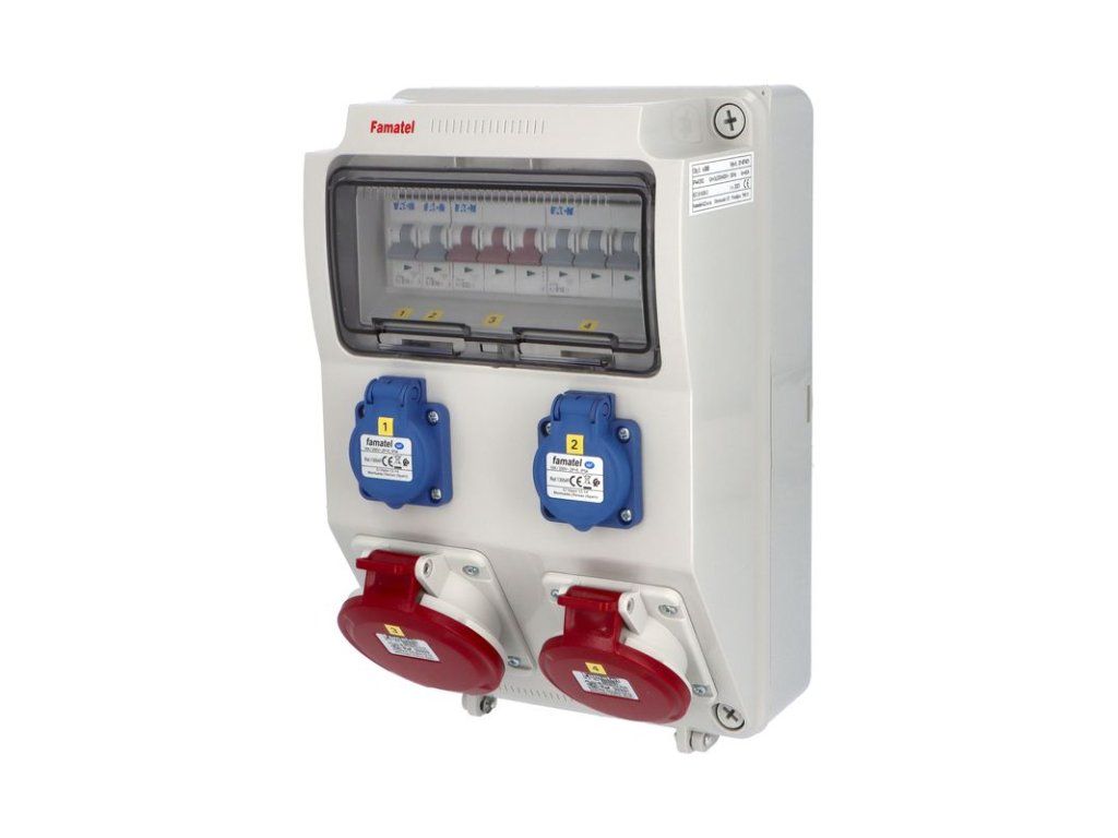 Zásuvková skříň FAMATEL v385-ZSF20101000.0 /3958 IP54 jištěná bez chrániče, zásuvky 2x230V, 1x16/5, 1x32/5, přístroje EATON 10kA: 2xPL7-B16/1, 1xPL7-B16/3, 1xPL7-B32/3, použité pouzdro: 3958 - 330x215x155mm, barva: světle šedá. Zásuvková skříň (rozváděč nízkého napětí) FAMATEL v385-ZSF20101000.0 /3958 IP54 jištěná bez chrániče, zásuvky 2x230V/16A (s ochranným kolíkem dle ČSN), 1x400V/16A/5pól, 1x400V/32A/5pól, jistící přístroje EATON 10kA: 2xPL7-B16/1, 1xPL7-B16/3, 1xPL7-B32/3, použité pouzdro: 3958 - celkem k dispozici 9mod. míst, rozměry: 330x215x155mm, plastová, materiál ABS, IK08, zkouška žhavou smyčkou 650°C, bezhalogenová a UV odolná, montáž na povrch, barva: světle šedá, rozsah teplot -25°C + 85°C, aplikované normy: IEC 61439-3 (Rozváděče nízkého napětí - Část 3: Rozvodnice určené k provozování laiky (DBO), balení: 1ks (fólie), zásuvky na 230V/16A s ochranným kolíkem dle ČSN, polykarbonátové okénko, jistící prvky EATON, PE svorkovnice součástí (6x16mm2), N svorkovnice součástí (6x16mm2), hladké stěny (bez prolisů) pro vyvrtání vstupního otvoru a následné osazení příslušnou vývodkou (pro CYKY 5x6; 4x10; 5x10 => M25; pro CYKY 5x16 => M32), max. připojitelný vstupní kabel = 4x25 nebo 5x16 (Cu), dodáno s průvodní dokumentací: štítkem rozváděče, návodem pro obsluhu a montáž, krycím listem (charakteristiky rozhraní), protokolem o kusové zkoušce, ES prohlášením o shodě, schématem zapojení a zkouškou oteplení pro rozváděče nízkého napětí. Pro montáž na hořlavé podklady je nutné použít nehořlavou podložku.Recyklační poplatek je zahrnut v ceně výrobku.