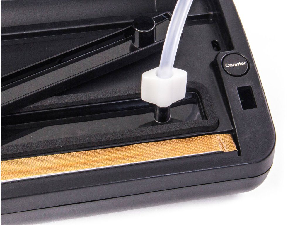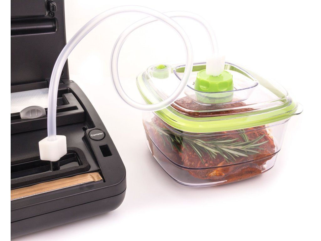 Vákuovačka G21 Nefrit odsáva vzduch nielen z vákuovacích vreciek alebo fólie v rolkách, ale aj z vákuovacích marinovacích dóz. Stačí napojiť hadičku na príslušný otvor vákuovacej dózy G21 (hadička je súčasťou balenia dózy) s objemom 1,4 alebo 2 l, stlačiť príslušné ovládacie tlačidlo a potraviny v dóze budú spoľahlivo zavákuované.