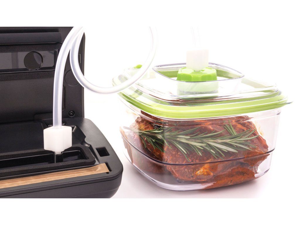 Vákuovačka G21 Onyx odsáva vzduch nielen z vákuovacích sáčkov alebo fóliou v rolkách, ale aj z vákuovacích marinovacích dóz. Stačí napojiť hadičku na príslušný otvor vákuovacej dózy G21 (hadička je súčasťou balenia dózy) s objemom 1,4 alebo 2 l, stlačiť príslušné ovládacie tlačidlo a potraviny v dóze budú spoľahlivo zavákuované.