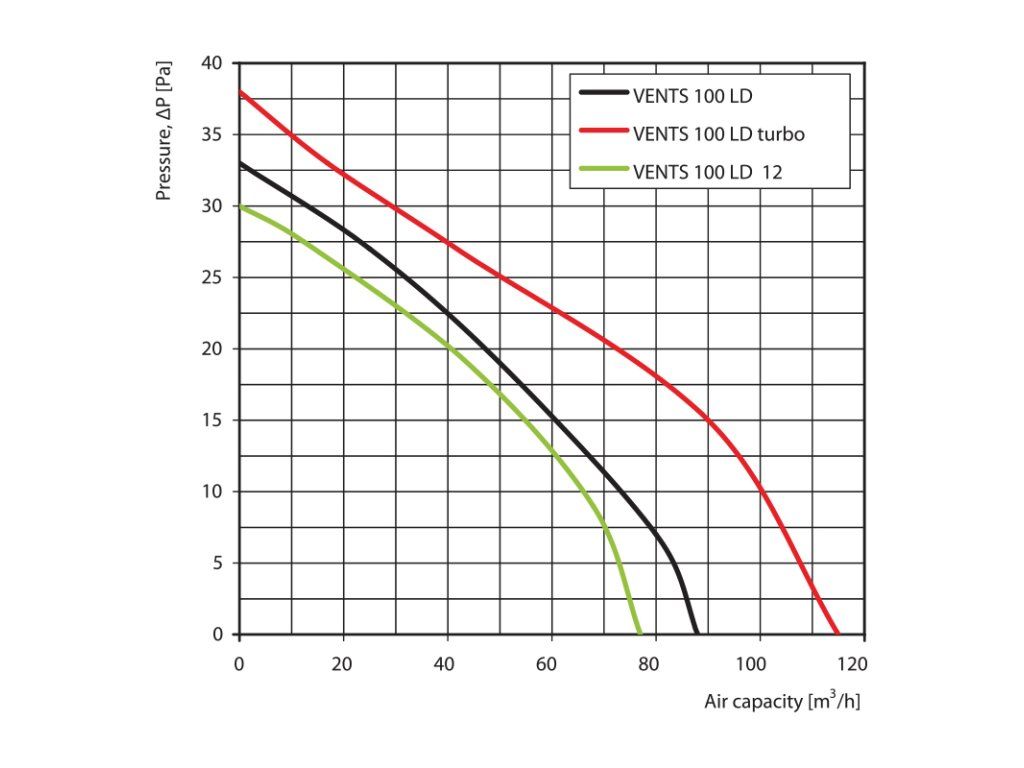 Domovní axiální ventilátor Vents LD je určen k odsávání vzduchu z menších bytových a nebytových prostor jako jsou koupelny, toalety, kuchyně, prodejny, kanceláře a podobně. Vzhledem ke svým technickým parametrům se doporučuje ventilátory používat v kombinaci s kratšími vzduchotechnickými potrubími s nižší tlakovou ztrátou, popřípadě k odsávání přímo přes stěnu. Základní model je vybaven motorem s kluzným uložením rotoru. V případě montáže do stropu nebo při využívání ventilátoru k dlouhodobému chodu se doporučuje použití ventilátoru vybaveného kuličkovými ložisky. Součástí ventilátoru není zpětná klapka. K tomuto ventilátoru je možno objednat zpětnou klapku „KO“.