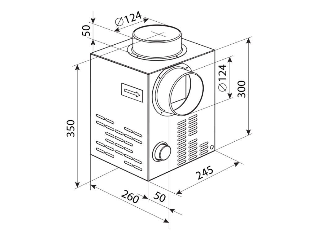 Ventilátor se instaluje tak, aby osa vrtule byla ve vodorovné poloze. Směr proudění vzduchu je vyznačen přímo na těle ventilátoru.