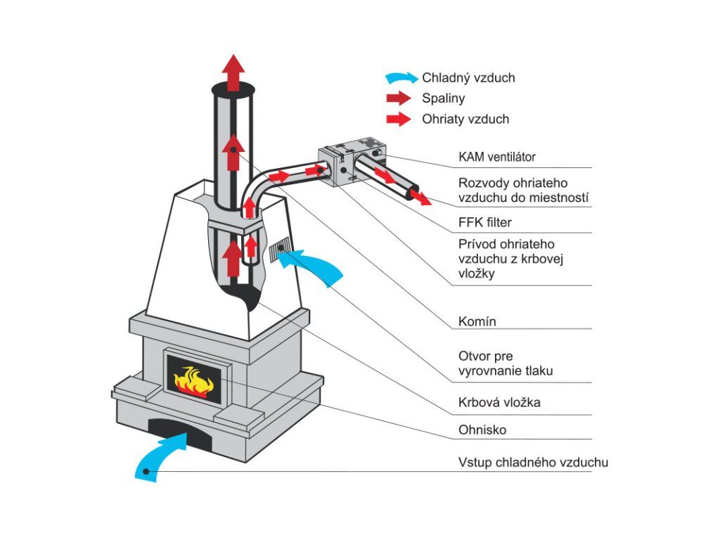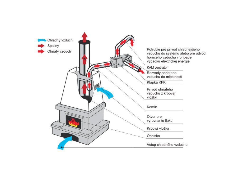 Krbové ventilátory KAM jsou určeny pro rozvod teplého vzduchu z krbové vložky do obytných místností. Ventilátory jsou vybaveny termostatem, který zajišťuje zapínání při požadované teplotě, který se dá nastavit v rozsahu od 0°C do 90°C. Dodatečně je možné vybavit ventilátor filtrem FFK, klapkou KFK nebo BY-PASS systémem GFK. Všechna potrubí pro rozvod ohřátého vzduchu do místnosti musí být izolována a měla by mít přibližně stejné délky. Ventilátor je rovněž vhodné vybavit klapkou KFK nebo BY-PASS systémem GFK, který zabraňuje přehřátí ventilátoru a jeho následnému poškození. KFK klapka se otevře při vysoké teplotě a umožňuje přívod chladnějšího vzduchu do systému v případě, že je ventilátor v provozu a naopak, pokud je ventilátor mimo provoz (např. výpadek elektřiny), zajišťuje odvod horkého vzduchu mimo systém. Potrubí z klapky KFK by mělo být vyvedeno směrem nahoru tak, aby horký vzduch v případě, že se motor vypne samovolně, stoupal. K ventilátoru lze připojit regulátor otáček Vents RS-1-400 i Vents RS-1,5-PS.