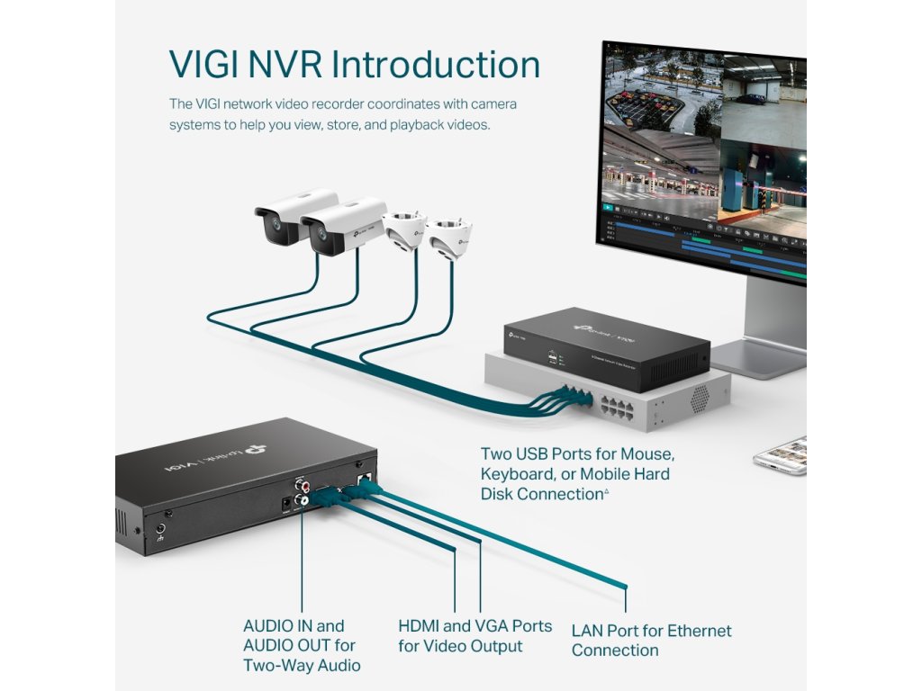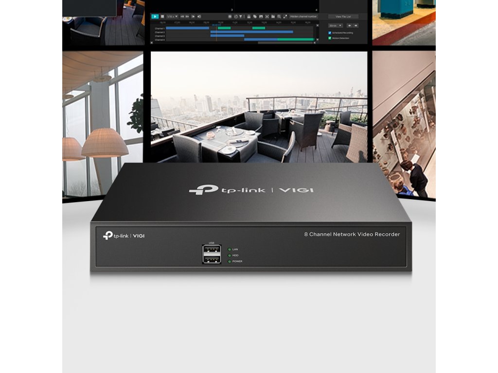 VIGI NVR1008H 8kanálový síťový videorekordér VIGI Nepřetržité nahrávání 24 hodin denně, 7 dní v týdnu: Automaticky ukládá až 10 TB záznamů z připojených kamer a zabezpečuje tak data pro rychlý a pohodlný přístup. 8kanálový živý náhled v reálném čase: Ostré rozlišení obrazu až 8 MPx a 8kanálové zobrazení zajišťují zachycení všech detailů z každého úhlu. Současné přehrávání: Přehrávejte záznam až ze 4 kamer† současně, zvyšte rychlost přehrávání a vyhledávejte události v přehledu záznamů pro snadné prohlížení záznamů. Vzdálené sledování: Speciální aplikace VIGI byla vyvinuta pro snadné a pohodlné vzdálené sledování. Chytré kódování videa H.265+: Kamera přenáší komprimovaný křišťálově čistý obraz, aniž by využívala jakoukoli další šířku pásma, čímž šetří místo na disku, snižuje zatížení sítě a náklady na monitorování bez ztráty kvality obrazu. Zajištění kompatibility s ONVIF**: Díky bezbariérové kompatibilitě můžete snadno přidat IPC od VIGI a jiných značek a vytvořit výkonnou a rozmanitou síť. 1 pevný disk (až 10 TB)?: Na pevný disk SATA lze uložit až 10 TB (720 dní* videa), takže vaše data jsou bezpečně uložena lokálně. Obousměrný zvuk: Díky podpoře hlasového interkomu můžete vést obousměrnou konverzaci a zároveň sledovat svůj kanál odkudkoli. Vhodné pro management. Šířka pásma pro přístup k videu 80 Mbit/s: Díky velké šířce pásma pro přístup k videu rekordér NVR dokáže obsluhovat více kamer s vysokým rozlišením. Na základě laboratorních testů s kamerami VIGI lze říci, že rekordér NVR VIGI zvládne obsluhovat až 8 4MPx kamer. NETWORK Protocol TCP/IP, DHCP, DNS, NTP, UPnP Incoming Bandwith 80 Mbps Outgoing Bandwidth 60 Mbps GENERAL Package Contents *VIGI Network Video Recorder *Power Adapter *HDD Screws *Mouse *Quick Installation Guide Operating Temperature -10–55 °C Dimensions( H X W X D ) 246.2 × 148.2 × 45 mm Weight 578.5 g External Power Supply DC 12V/1.5A Power Consumption 4.25 W (without disk) VIDEO/IMAGE Video Input 8-Channel IP Video Input, up to 8 MP Resolution Video Output Recording Resolution: 8 MP / 5 MP / 4 MP / 3 MP / 1080p / UXGA 720p / VGA / 4CIF / DCIF / 2CIF / CIF / QCIF HDMI/VGA Output Resolution: 1920 × 1080p/60Hz, 1280 × 1024/60Hz, 1280 × 720/60Hz, 1680 × 1050/60Hz, 1440 × 900/60Hz DECODING Decoding Format H.265+/H.265/ H.264+/H.264 Live View/Playback Resolution 8 MP / 5 MP / 4 MP / 3 MP / 1080p / UXGA 720p / VGA / 4CIF / DCIF / 2CIF / CIF / QCIF Synchronous Playback 4 Channel† Capability 2-ch @ 8MP, 4-ch @ 4MP, 8-ch @ 2MP HARD DISK SATA 1 SATA Interface Capacity Up to 10 TB INTERFACES Network Interface 1 RJ-45 10/100 Mbps Self-Adaptive Ethernet Interface USB Interface 2× USB 2.0Dodatočné parametre