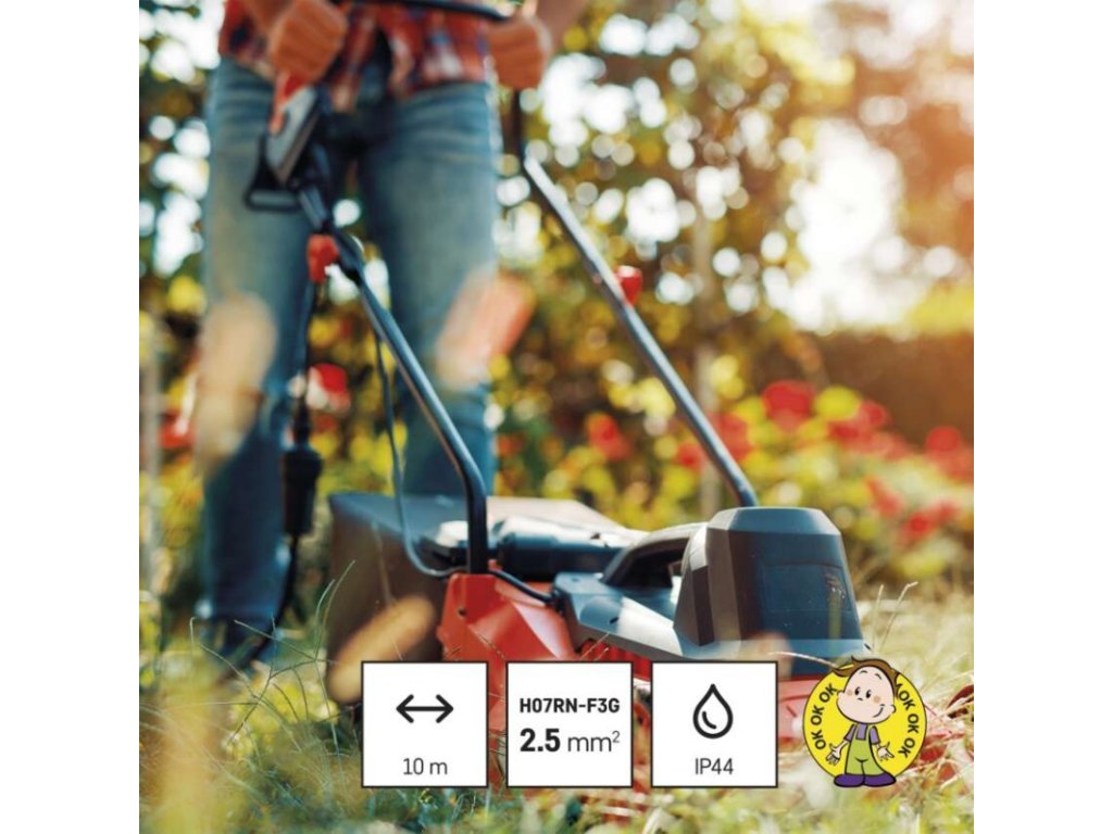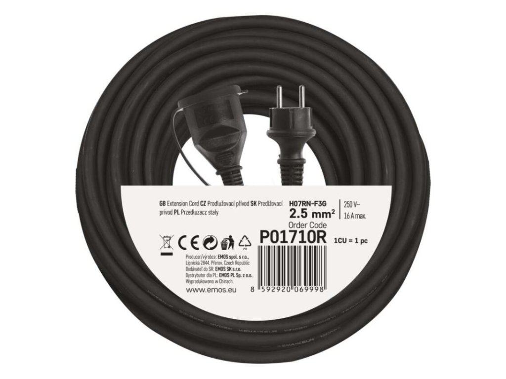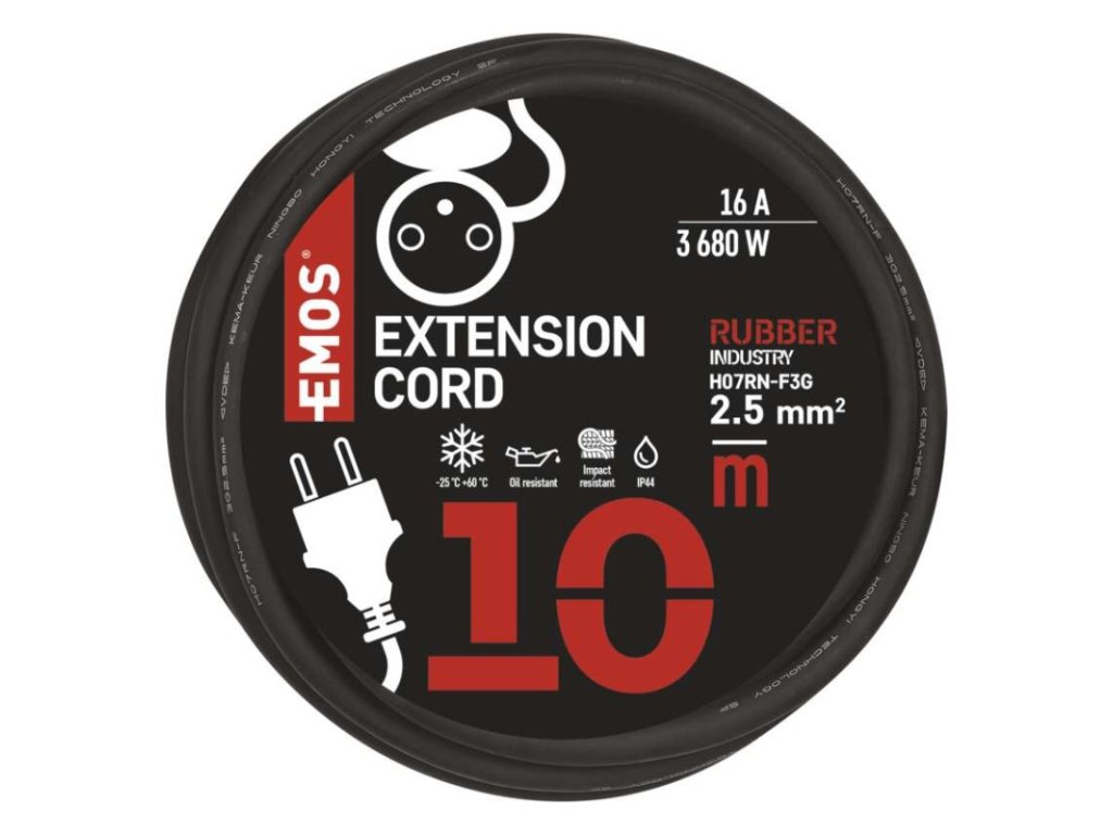 ďalšie funkcie: nie|detské clonky: áno|dĺžka: 10 m|farba: čierna|hmotnosť: neuvádza sa|krytie: IP44|max. zaťaženie navinutého: neuvádza sa|max. zaťaženie rozvinutého: 16 A max./3 680 W|napätie: 230 V|počet zásuviek: 1|predajný obal: 1 ks, fólia|prierez vodiča: 2,5 mm²|produkt: predlžovací prívod–spojka|prúd: 16 A|rozmer: neuvádza sa|tepelná poistka: nie|typ izolácie: guma/neopren|vodič: H07RN-F3G|záručná doba: 2 rokyDodatočné parametre