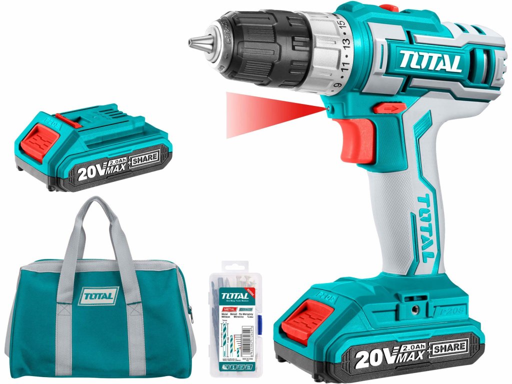 Vrtací šroubovák aku, 2x2000mAh, 20V Li-Ion, v tašce, sada 47ks, nabíječka 2h TOTAL-TOOLS