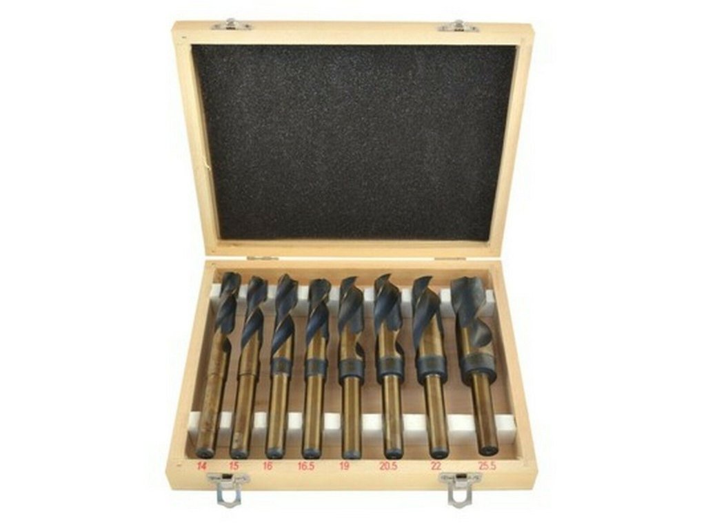 Sada vrtáků NWK s válcovou stopkou. Sada vrták velikosti 14, 15, 16, 16,5, 19, 20,5, 22, 25,5 mm.Použití: pro průmyslové použití včetně vytváření otvorů při tvrdé oceli legované a nelegované oceli a nerezové oceli, tepelně-austenitická ocel, titan a slitiny titanu, konstrukční oceli, šedá litina a tvárná litina, bronz, cín, zinek, bronz, hliník, Zamak, grafit, slinutý kovový prášek, alpaka a dříví.