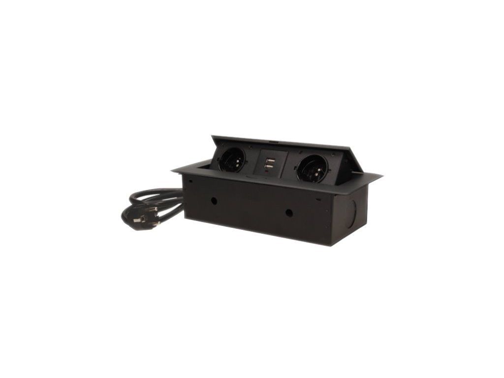 ORNO Výklopný blok zapustený, 2x 230V a 2x USB, čierny, kábel 3mVýklopný zásuvkový blok v striebornej farbe určený na vnútornú inštaláciu do stolov, stolových dosiek, pracovných dosiek v kuchyni, kancelárii ako vo vertikálnom tak aj horizontálnom smere. Výklopná časť obsahuje 2 uzemnené zásuvky, 2x USB port (bez napájania) a horný rám zásuvky je hrúbky 7 mm. Zosilnený horný kryt je vyrobený zo zinkovej zliatiny a montážny box je z oceľového plechu.