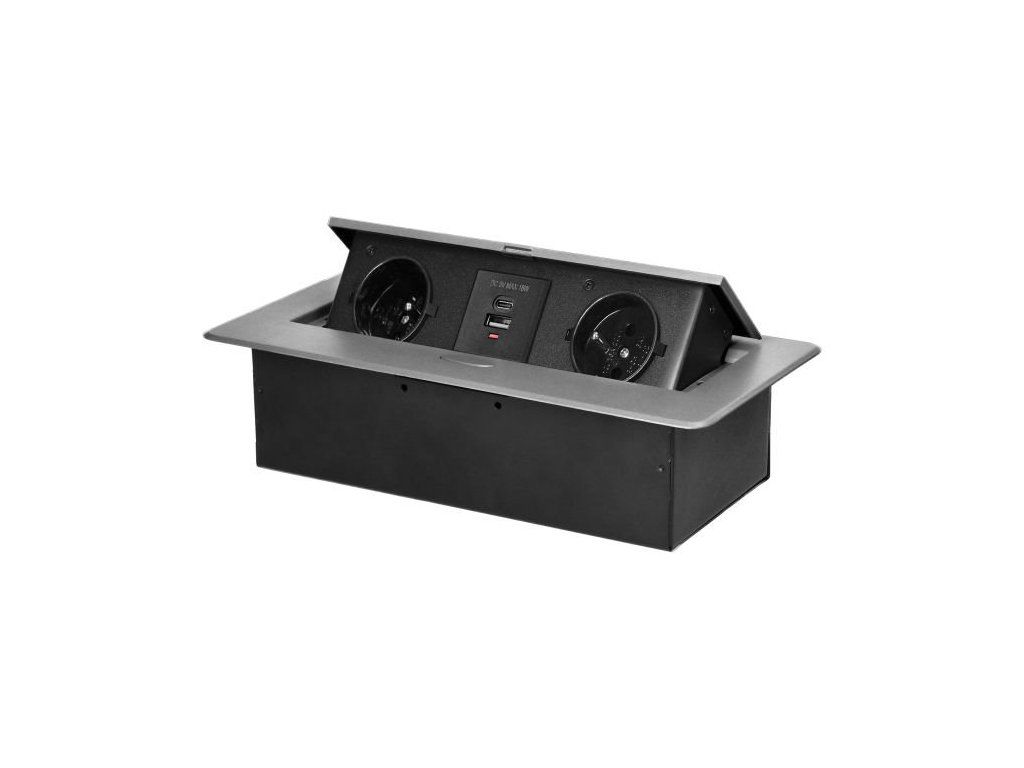 Uzatváracia, zapustená nábytková zásuvka umožňuje pripojenie dvoch zariadení súčasne, pretože je vybavená dvoma uzemnenými zásuvkami francúzskeho typu (2x2P+E) a ďalšími dvoma, napájanými z dvoch USB portov (typ A a C).