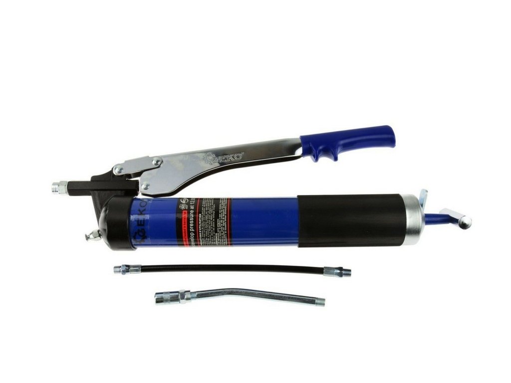 Odolná mazací pistole od společnosti GEKO. Vytváří tlak až do 12 000 PSI. Mazací pistole má krátký zdvih, takže je vhodný pro použití v místech s omezeným prostorem.