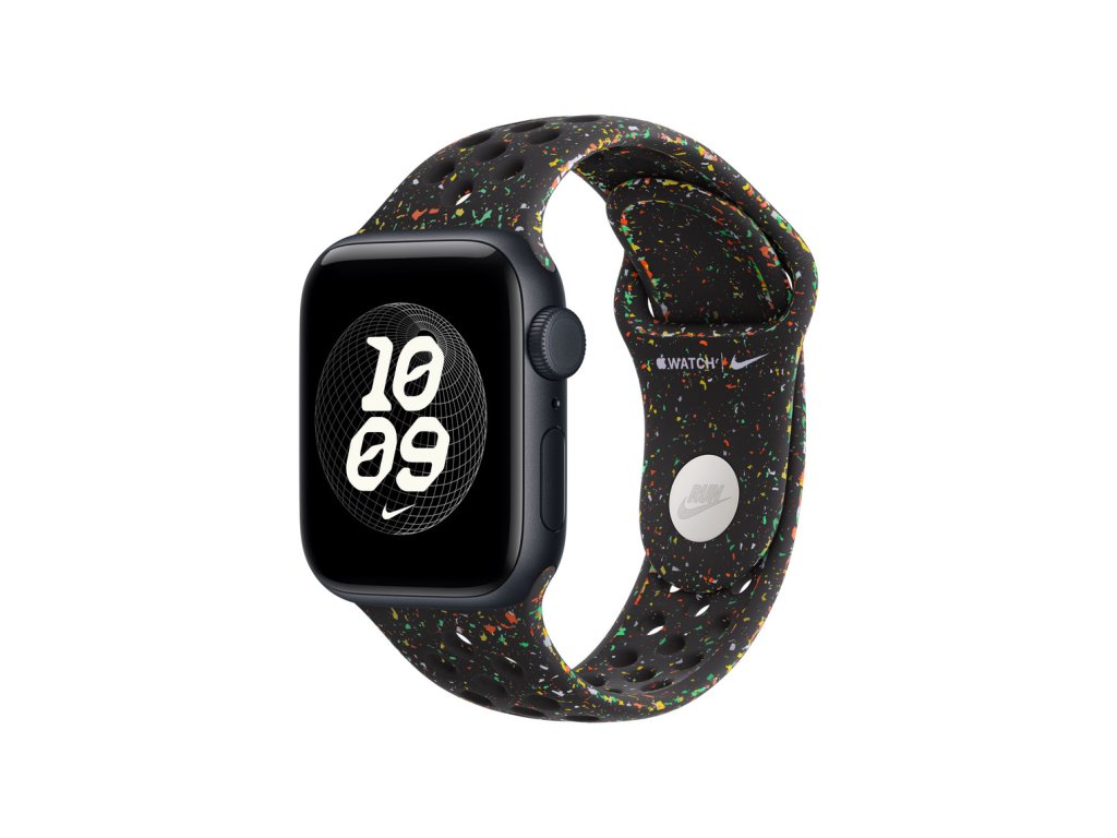 42mm Midnight Black sportovní řemínek Nike Tenhle sportovní řemínek Nike má vylisované otvory pro větší vzdušnost, je odolný, pevný a přitom překvapivě poddajný. Obsahuje barevné vločky, které tvoří náhodné vzory, takže každý řemínek je originál. Jeho hladký, hutný materiál se elegantně ovine kolem zápěstí a příjemně sedí. A zapíná se na hliníkový kolíček s matným povrchem, do kterého je pečlivě vygravírované logo Nike Run. *Materiál: Hliník, Fluoroelastomer Kompatibilita Modely Apple Watch *38 mm *40 mm *41 mm *42 mm S/M: Na zápěstí s obvodem 130–180 mm.Dodatočné parametre