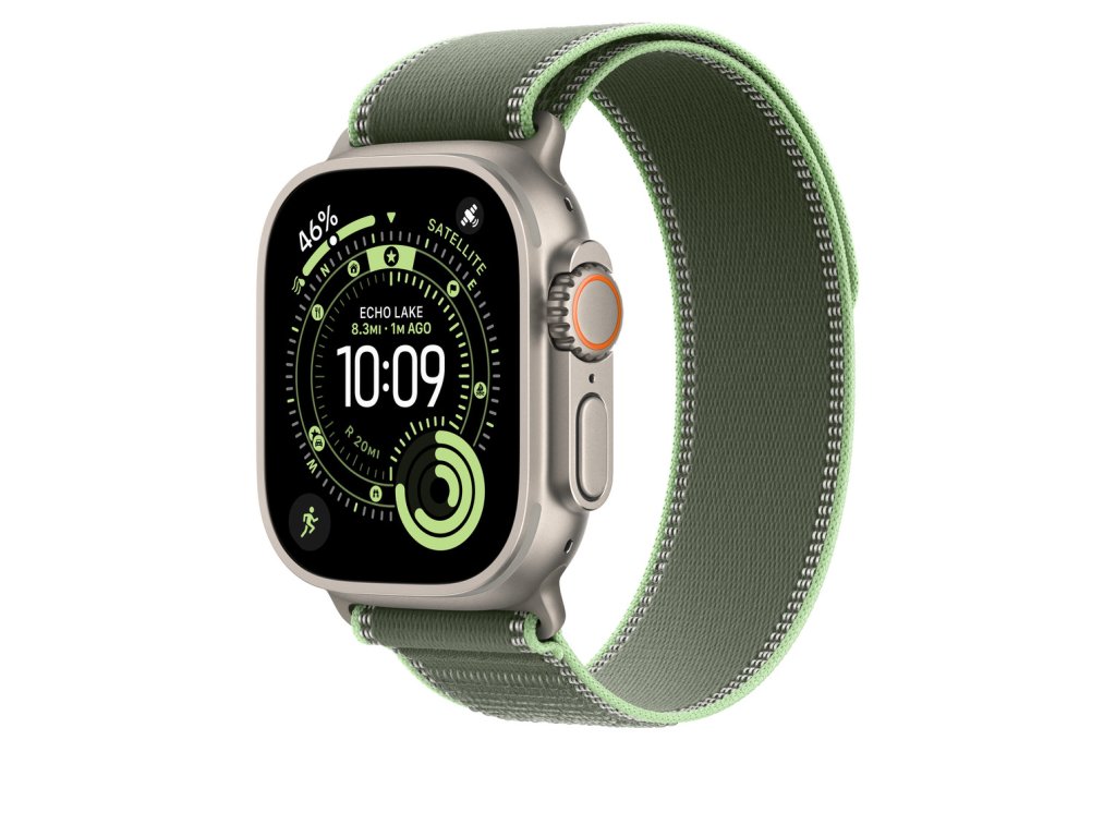 49mm zelený/neonový Trailový tah – provedení z přírodního titanu Ultratenký, lehký a strečový řemínek vyrobený z nylonové tkaniny, která je elastická a pohodlná na nošení. Má praktické zapínací poutko na rychlé úpravy dotažení v poklusu a nově i reflexní vlákna po okrajích. *Materiál: 90% podíl recyklovaného titanu, 100% recyklovaný polyester, 100% recyklovaný elastan, 60% recyklovaný nylon Kompatibilita Modely Apple Watch *44 mm *45 mm *46 mm *49 mm S/M: Na zápěstí s obvodem 130–180 mm.Dodatočné parametre