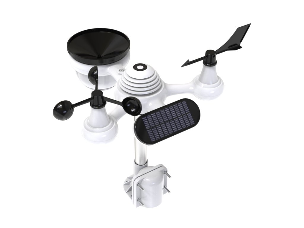 - barva bílá, úchyt montážní tyče, solární panel, nálevka srážkoměru, korouhvička a větrník černá