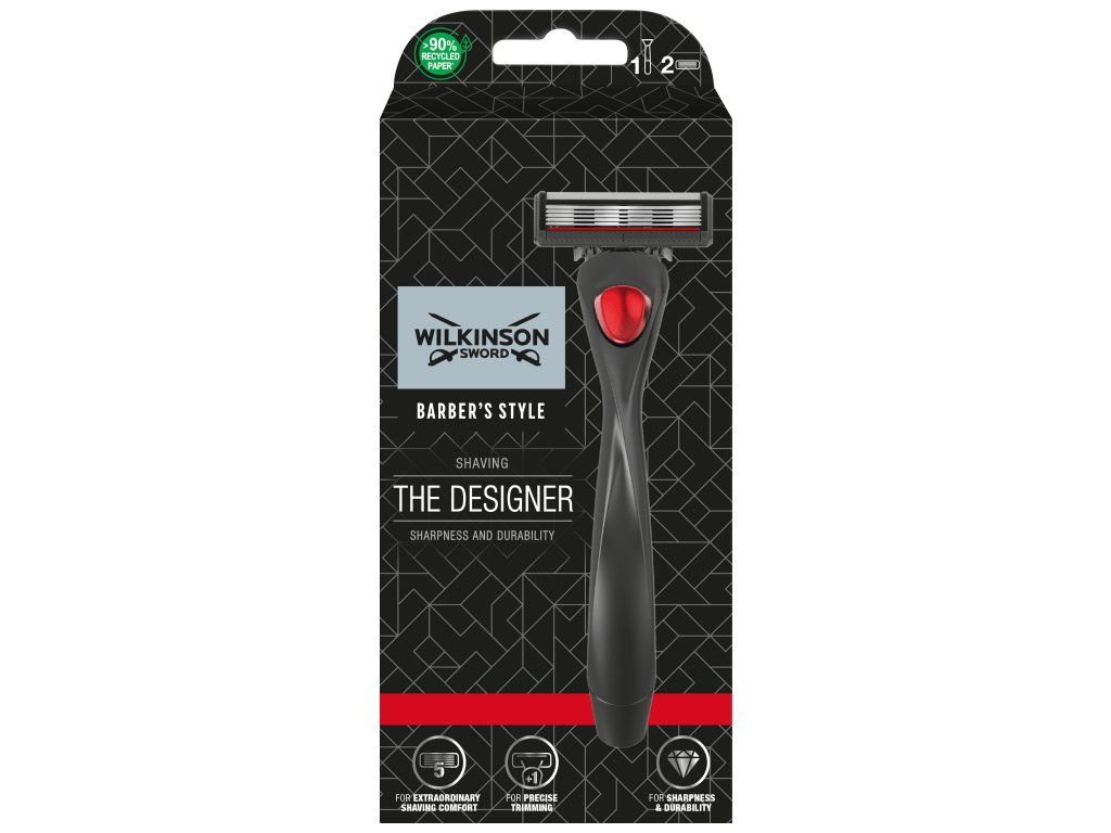 Pánsky holiaci strojček Wilkinson Barbers Style The Designer obsahuje 5 čepelí potiahnutých diamantom pre ostrosť a odolnosť, sú ideálne rozmiestnené pre pohodlné použitie a oplachovanie. Lubrikačné pásiky pred a za čepieľkami pomáhajú znižovať podráždenie pri holení. Má tiež obrysovú čepeľ na zadnej strane, pre oholenie ťažko dostupných miest.