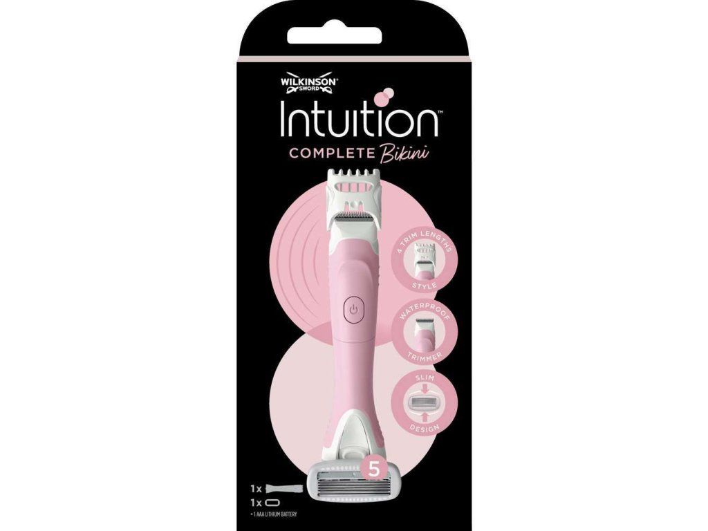 Vodeodolný zastrihávač Wilkinson Intuition Bikini Trimmer so 4 nastaviteľnými dĺžkami zastrihávania. Má 5 čepieľok pre hladké oholenie, zakrivenú hlavicu pre náročné zóny. Gél na ochranu pokožky znižuje podráždenie (pre jemné oholenie).