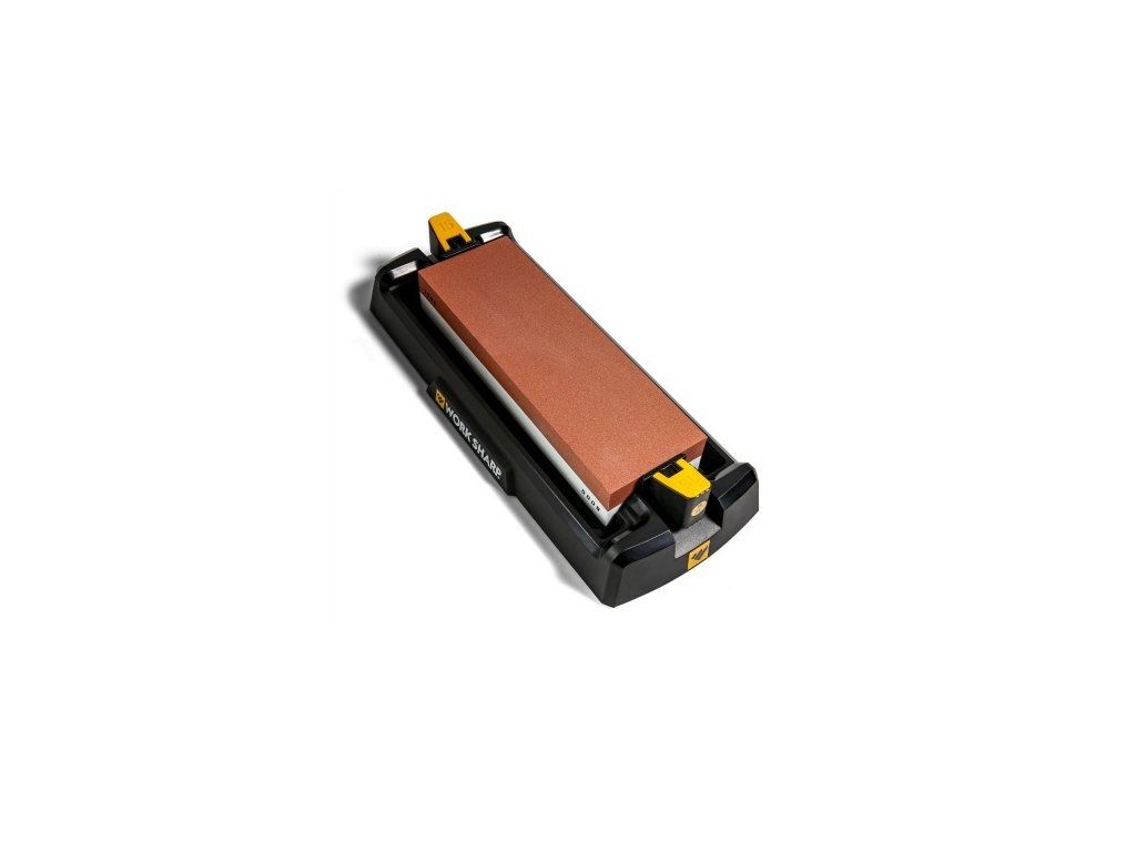 Brúska Work Sharp Benchtop Whetstone Knife Sharpener na brúsenie nožov. Umiestnený je v plastovom držiaku, ktorý zároveň slúži ako pomôcka pri dodržaní správneho brúsneho uhla. Behom niekoľkých sekúnd možno nastaviť uhol 15° alebo 17°.