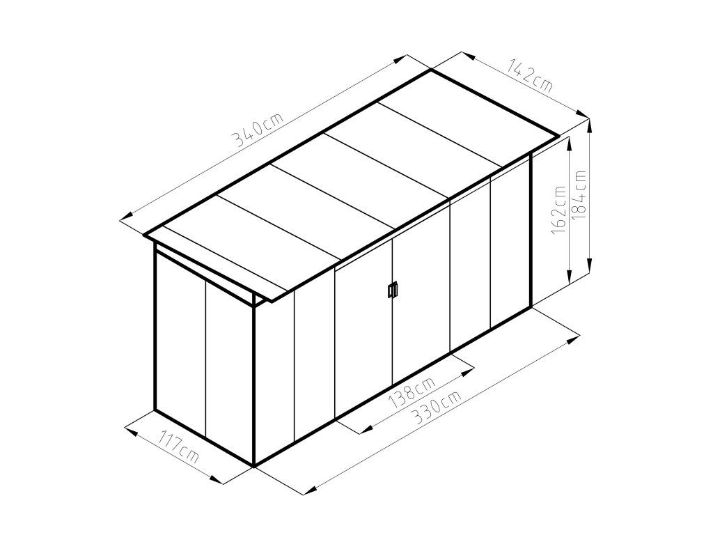 - Vonkajšie rozmery – so strechou (š x d x v): 340 x 142 x 184 cm