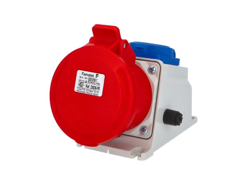 Zásuvka nástěnná kombinovaná 23626-FR IP54/1x230V/16A, 1x400V/32A/5 - SpeedPRO. Zásuvka nástěnná kombinovaná 23626-FR, IP54, 1x230V/16A, 1x400V/32A/5, bez jištění 400 V zásuvky (nutno jistit a chránit přívodním kabelem), zásuvka 230V/16A (s ochranným kolíkem dle ČSN) je odjištěna pojistkou 10 A / 230 V (5x20 mm).Dodatočné parametre