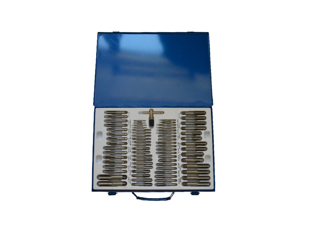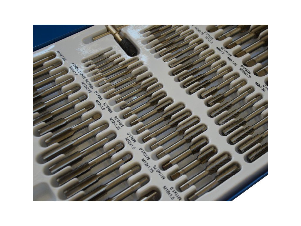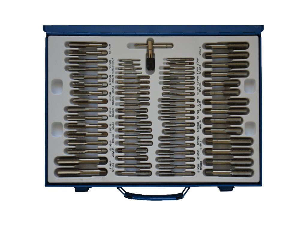 110-dílná sada metrických závitníků a závitových oček ze standardní nástrojové oceli pro ruční závitování pomocí vratidla.Specifikace