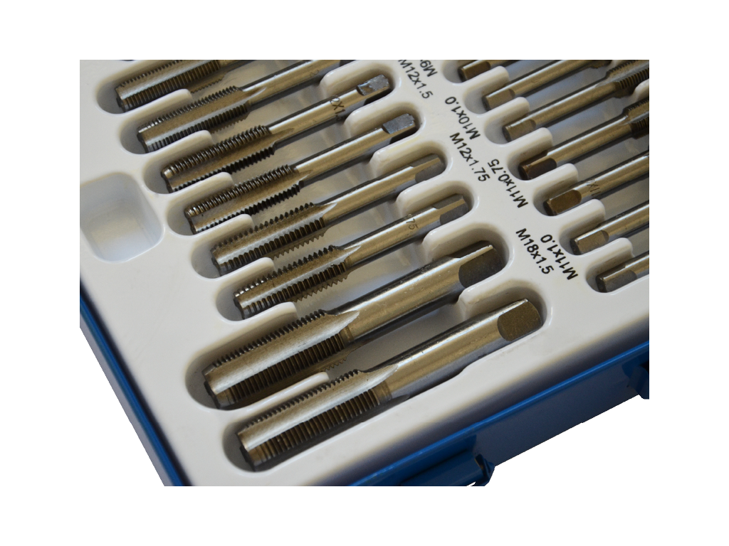 - obsahuje dva závitníky od každého rozměru, první závitník s jemnějším náběhem a druhý na finální dokončení závitu i v zaslepené díře
