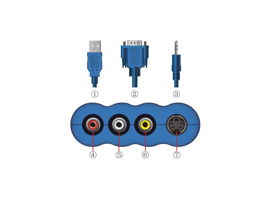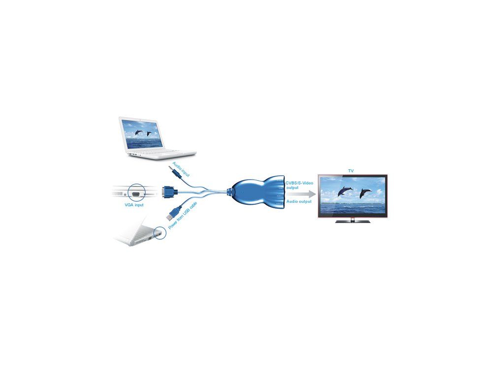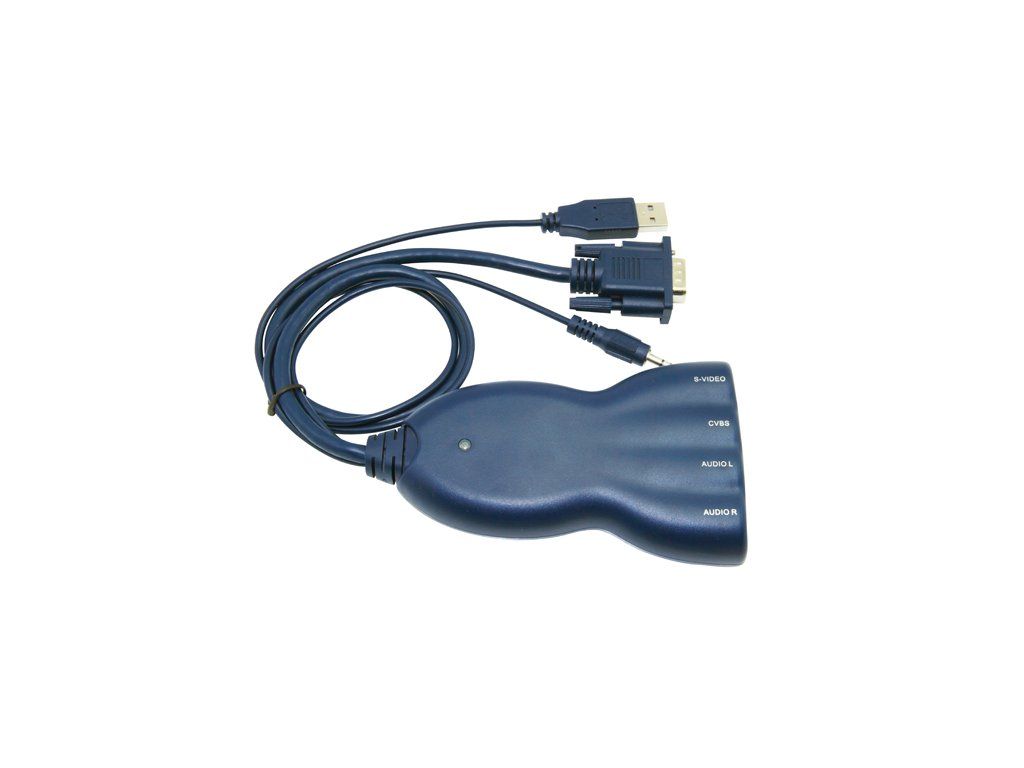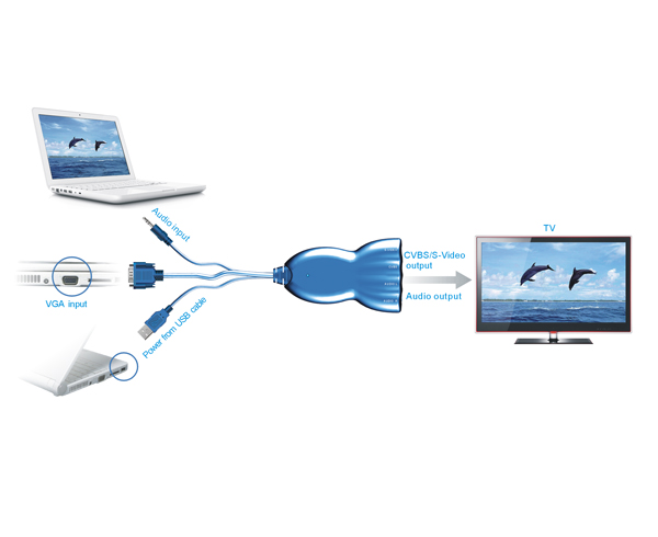 Umožňuje přenos obrazu a zvuku z notebooku či stolního PC vybaveného pouze VGA výstupem do televizoru - disponuje vlastním napájením přes USB rozhraní - 1 vstup 1 X VGA, 1 x 3,5 mm jack pro audio - výstup obrazu: 1 x kompozitní video přes RCA, 1 x S-video - výstup zvuku: 2 x RCA stereo - VGA rozlišení: 640 X 480 (60/75Hz), 800 X 600 (60/75Hz), 1024 X 768 (60/75Hz), 1280 X 768 (60HZ), 1280 X 1024 (60HZ); - výstupní signál: CVBS (1.0Vpp), S-Video (Y: 1.0Vpp, C: 003Vpp); - napájenír: DC 5V 1A /přes vestavěný USB kabel, další zdroj není třeba/ - pracovní teplota: 25~75°C; - relativní vlhkost: 10% ~ 65%; - rozměry: 130*75*27 mm (L*W*H).Dodatočné parametre