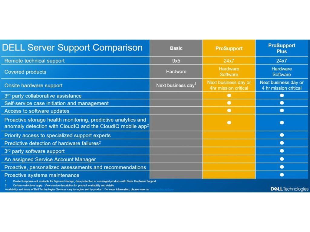 Dell prodloužení záruky pro PowerEdge R360 Prodloužení záruky pro servery PowerEdge R360 z Basic NBD záruky (3 roky) na ProSupport NBD (5 let) záruku. Pro objednání záruky budeme potřebovat Service Tag (výrobní číslo) serveru. Záruku je možné objednat do 1 měsíce od nákupu. Srovnání DELL záruk uvedeno v přiložené tabulce. Dle potřeby naceníme libovolný typ a délku záruky k novým i již používaným serverům. Služba Dell ProSupport poskytuje 24 hodin denně, 7 dní v týdnu oblastní podporu hardwaru a softwaru, proaktivní automatizovanou podporu, která zkracuje dobu, po kterou je zařízení mimo provoz a po provedení vzdálené diagnostiky zahrnuje službu na místě. Se službou Dell ProSupport se vám dostává podpory vysoce kvalifikovaných techniků společnosti Dell. Můžete se tak soustředit na to, co je pro vás důležité. S opravou následující pracovní den na místě po provedení vzdálené diagnostiky. Se službou ProSupport dostanete: Proaktivní automatizované rozpoznání a upozornění na závažné problémy pomocí technologie Dell SupportAssist. Přímý přístup k vysoce kvalifikovaným technikům 24 hodin denně, 7 dní v týdnu. Podporu následující pracovní den na místě po provedení vzdálené diagnostiky. Jeden jediný zdroj pro hardwarovou a softwarovou podporu.Dodatočné parametre